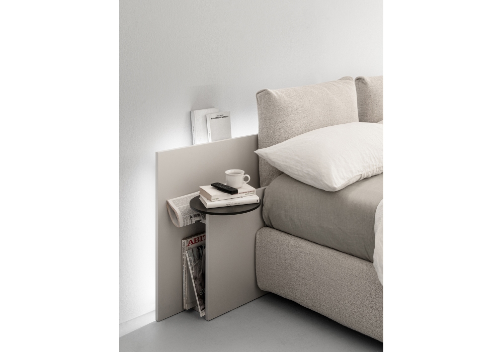 Let's Space diseñada por Monica Graffeo para Caccaro es una cama con cabecero que puede ocupar toda la longitud de la pared, un nicho, o quedar libre en el centro o colocarse a un lado, lamé o lacado mate en diferentes acabados. Disponible en la versión de caja de almacenamiento o de cama en varios tamaños y revestimientos. Colchón no incluido.