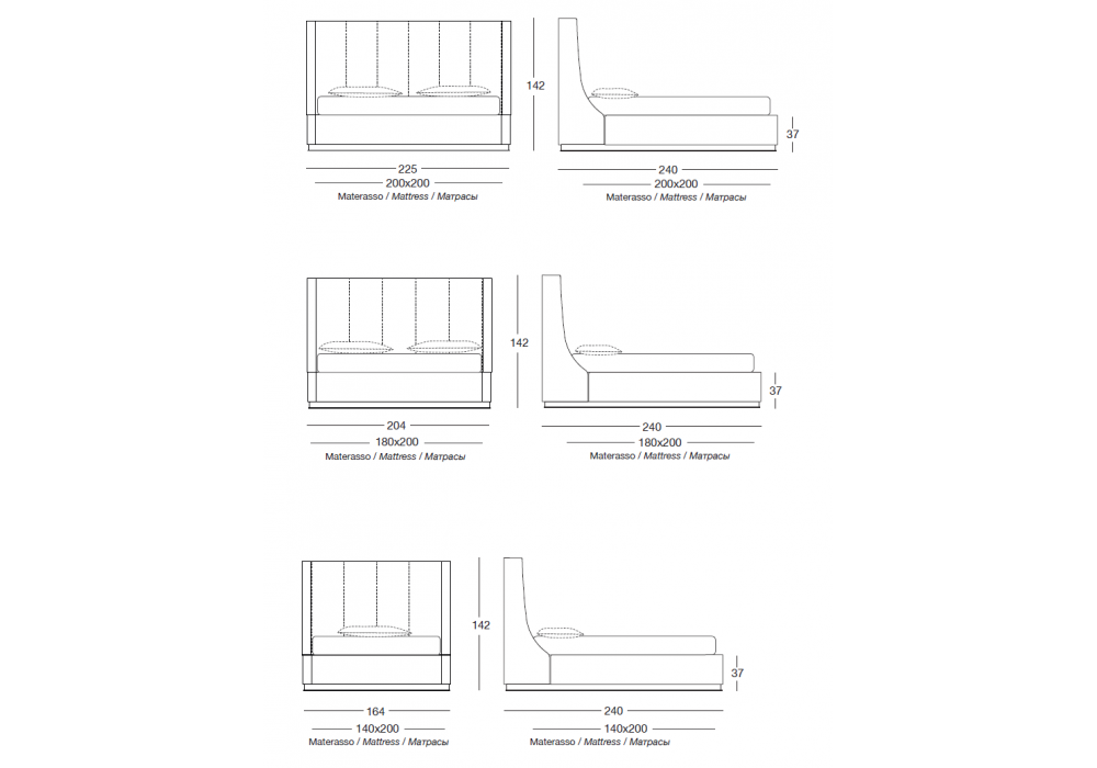 Kubrick diseñada por Giuseppe Viganò para Longhi es una cama con estructura de madera recubierta de espuma de poliuretano de doble densidad, rígida en la estructura, mediana en la cabecera. El somier del somier, separado del cabecero, se ensambla mediante ángulos metálicos que permiten un montaje sencillo y permiten el posicionamiento y altura del somier, rebajándolo del borde de la cama. Base de metal pintado en polvo en acabado negro o bronce y estructura revestida en piel o tejido fijo. Bajo pedido es posible insertar un par de redes electrificadas.