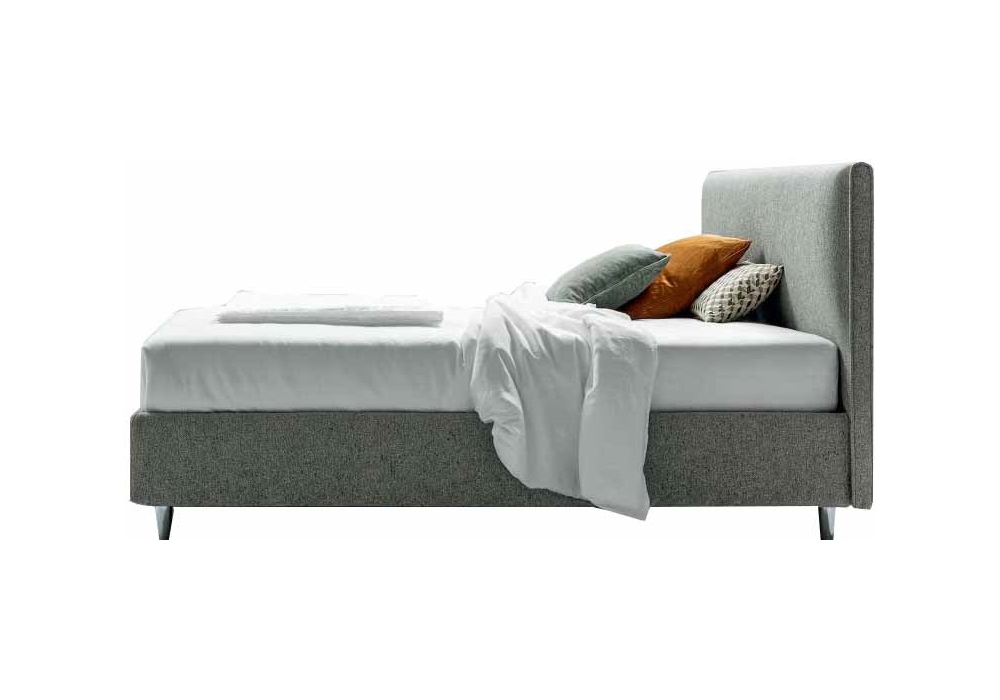 Dread diseñada y producida por Twils es una cama tapizada con somier de 14 o 25 cm de altura, realizada en diferentes medidas. La funda extraíble está disponible en varios tejidos y colores. Los pies (PIE41) son cuadrados inclinados en acabado aluminio pulido (bajo pedido, también disponible en otras formas y acabados).