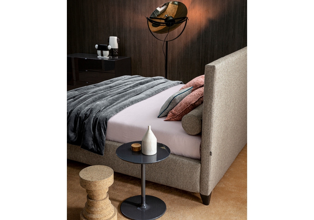 Max Alto diseñada y producida por Twils es una cama tapizada con un somier de 14, 22 o 28 cm de altura. La funda desenfundable (no en la versión de piel) está disponible en varios tejidos y colores. La cama está disponible en diferentes diseños y tamaños. Los pies son de madera inclinada con acabado de nácar o de aluminio pulido.