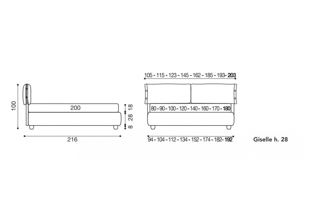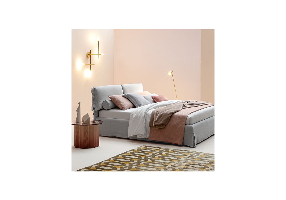 Giselle diseñada y producida por Twils es una cama tapizada con un somier de 25 cm de altura. La funda extraíble está disponible en varios tejidos y colores. La cama está disponible en diferentes diseños y tamaños. Los pies son de madera inclinada con acabado de nácar.