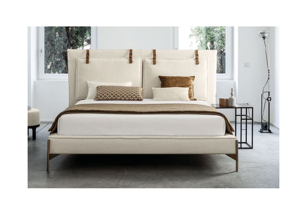 SP2802 Belt diseñada por Silvia Prevedello para Twils es una cama tapizada con somier de 18 o 28 cm de altura, con cabecera baja con cojines de apoyo sostenidos por cuatro cinturones de cuero. La funda extraíble está disponible en varios tejidos y colores. La cama está disponible en diferentes diseños y tamaños. Los pies tienen un acabado de grafito o madera de color nácar.