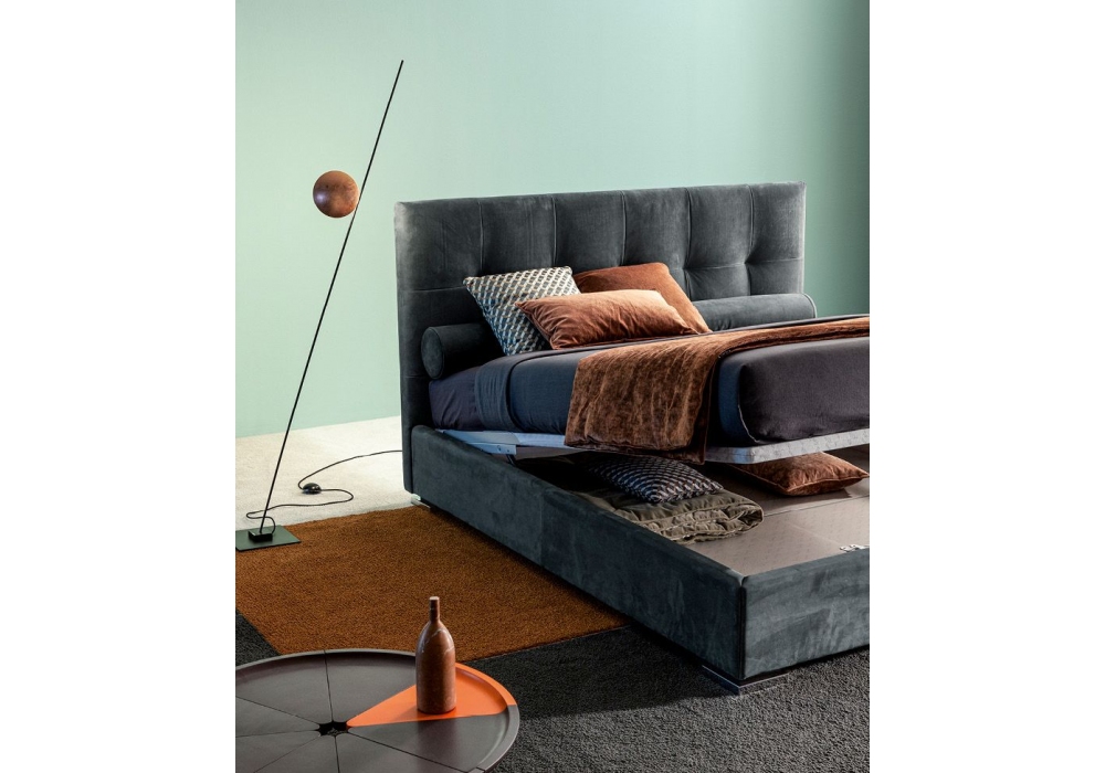 Max Basso Capitonné diseñada y producida por Twils es una cama tapizada con un somier de 14, 22 o 28 cm de altura y cabecera baja. La funda no desenfundable está disponible en varios tejidos y colores. La cama está disponible con o sin caja de almacenamiento. Los pies son de aluminio pulido o de madera inclinada con acabado nácar.