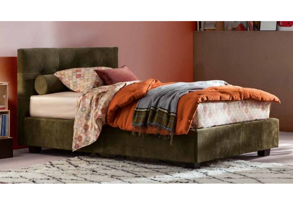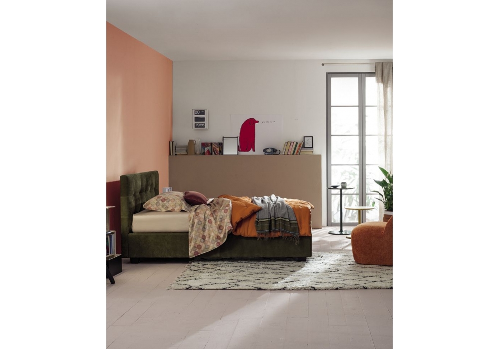 Max Basso Capitonnè diseñada y producida por Twils es una cama individual con un somier de 28 cm de altura. Los pies son de nácar (PIE3D). Funda desenfundable en diferentes tejidos y colores. Disponible en diferentes modelos y tamaños. Bajo pedido, los pies se pueden fabricar en otros acabados.