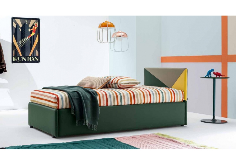 Maya Mod. 2 diseñada y producida por Twils es una cama individual extraíble con caja lateral. La funda extraíble está disponible en varios tejidos y colores. Bajo pedido, puede ser bicolor con decoración Triangle.