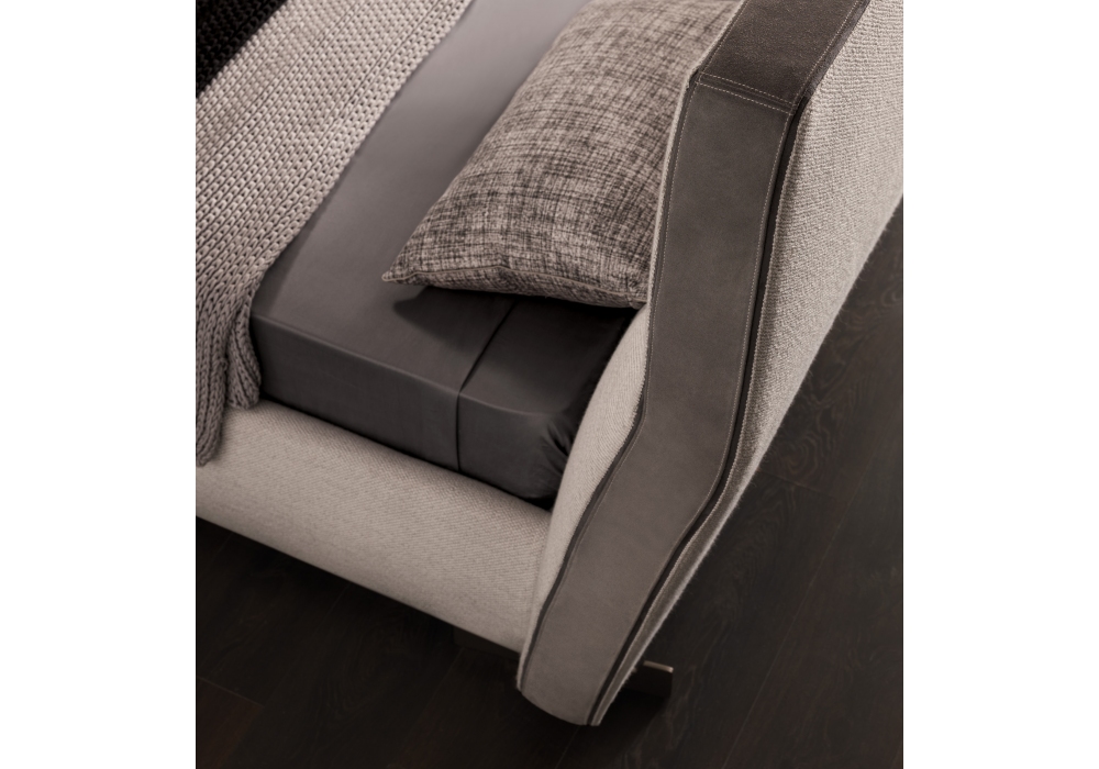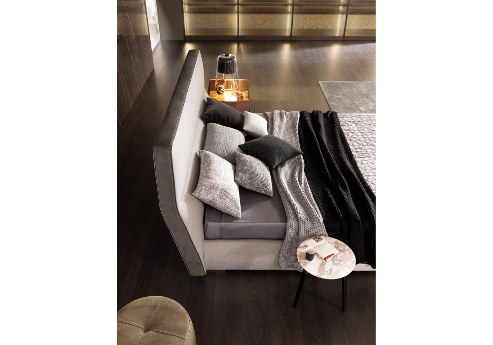 Cosy diseñada por Mauro Lipparini para MisuraEmme es una cama con cabecera acolchada con tapizado fijo en tejido, ecopiel o piel. Disponible en la versión con somier elevable o con somier fijo.