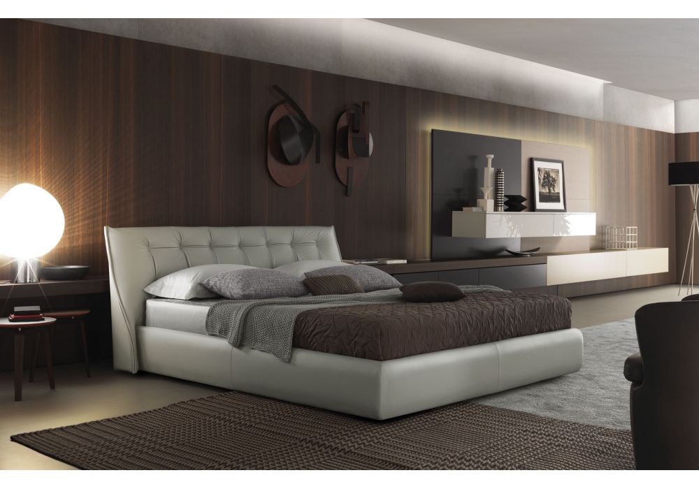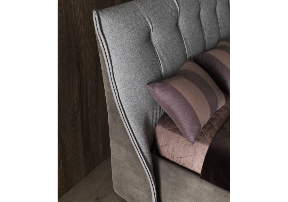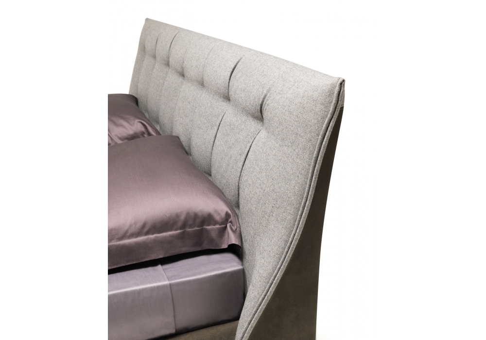 Sumo diseñada por Mauro Lipparini para MisuraEmme es una cama con cabecera acolchada con tapizado fijo en tejido, ecopiel o piel. Bajo pedido, es posible cubrir la parte delantera del cabecero con un tejido diferente al cubrecama. Disponible con somier elevable o con somier fijo.