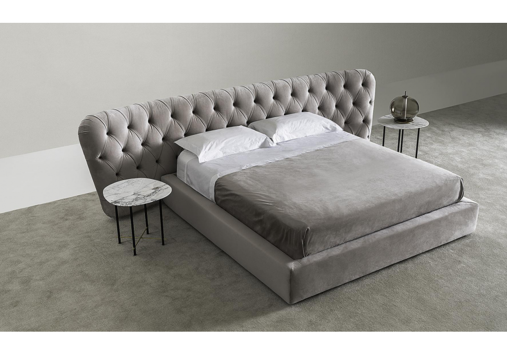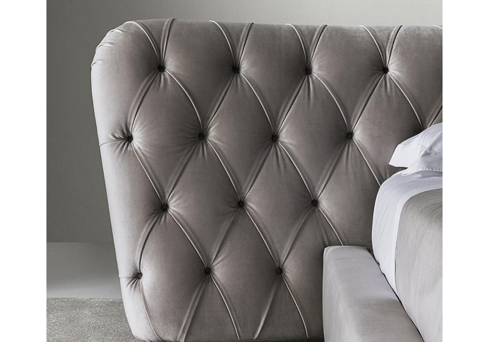Royale Capitonné conçu par Castello Lagravinese Studio pour Casamilano est un lit avec tête de lit capitonnée en sapin massif, contreplaqué de pin et MDF. Base en panneaux de particules avec pieds en ABS. Rembourrage en mousse de polyuréthane et revêtement fixe en différents tissus ou cuirs.