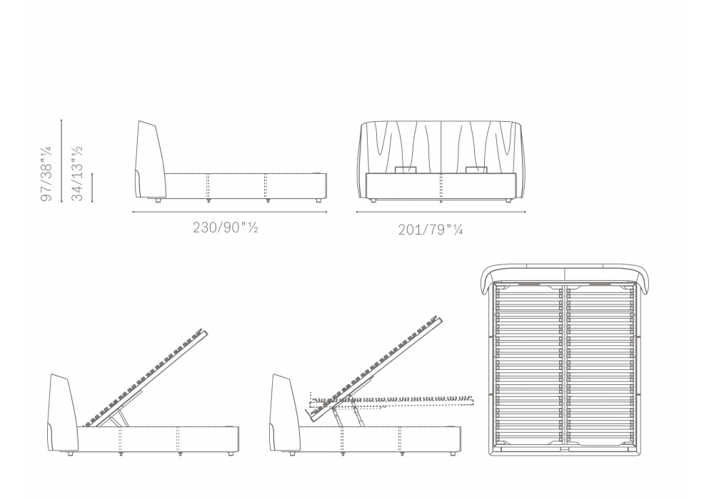 Cama con contenedor Archibald diseñada por Jean Marie Massaud para Poltrona Frau con cabecera de polimex® y contrachapado de abedul acolchado con espuma de poliuretano y guata de poliéster. La estructura está formada por tableros de madera de abeto con laterales de contrachapado de chopo. Los pies son de aluminio cilíndrico pintado de negro. La cama Archibald con almacenaje está disponible en diferentes acabados y versiones.