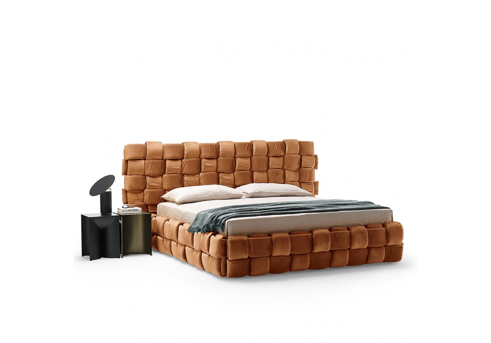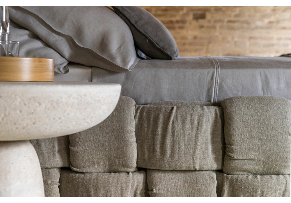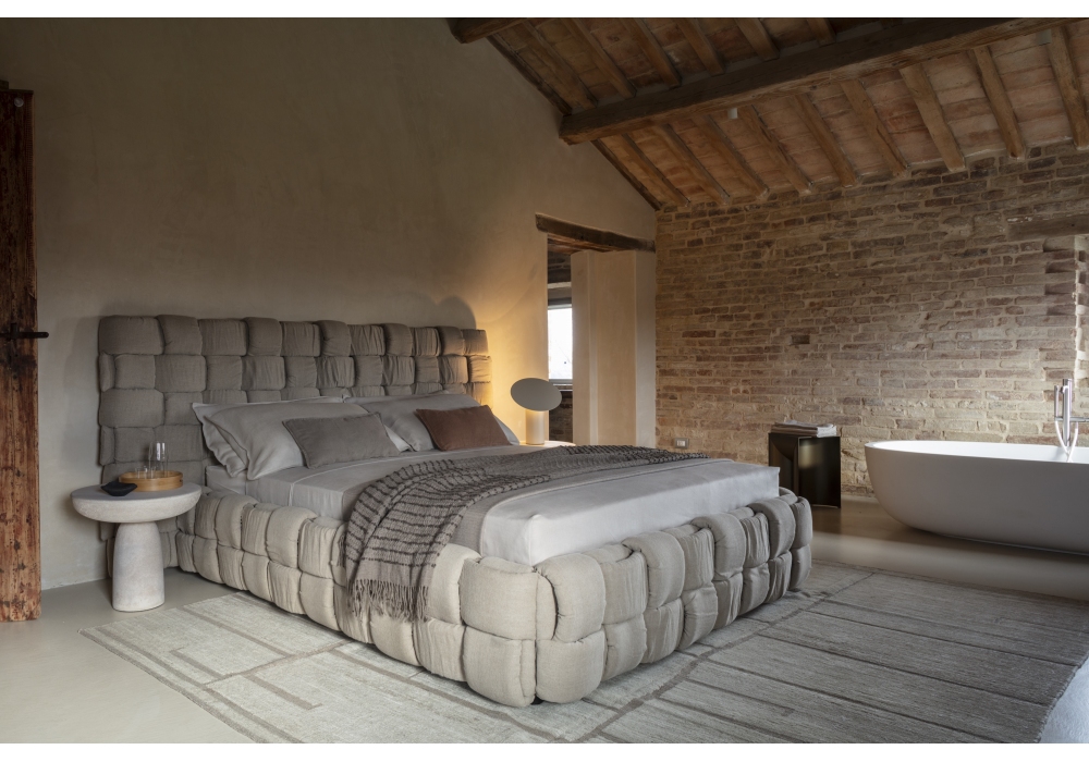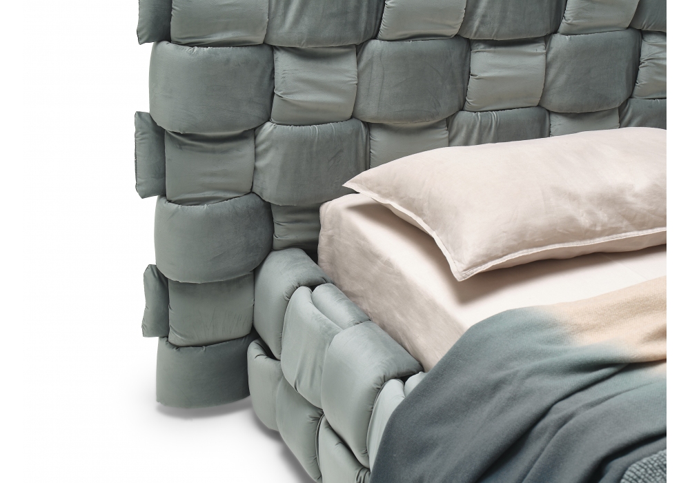 Flirt diseñada por Bellavista Piccini para Mogg es una cama tapizada con revestimiento desenfundable en tela, completa con somier de láminas de madera de haya.