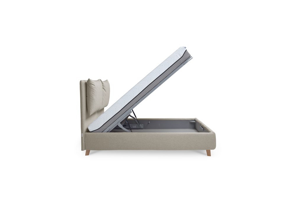 La cama Tempur Due está realizada con tapizado en tejido o ecopiel. Somier integrado en diferentes versiones y pies en diferentes modelos.