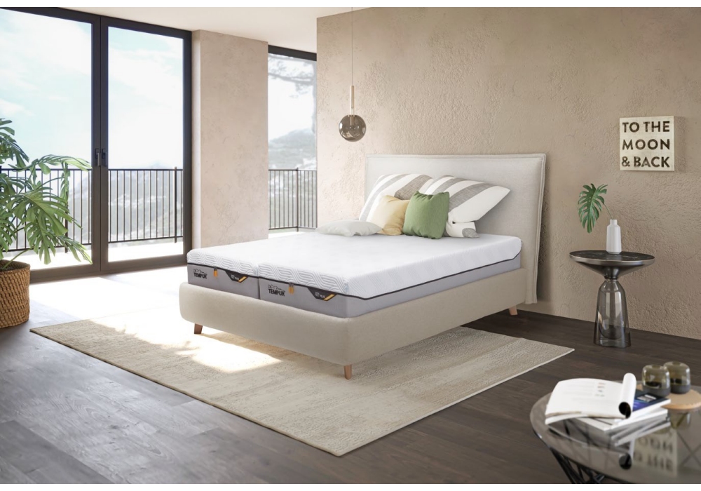 La cama Tempur Tre está realizada con tapizado en tejido o ecopiel. Somier integrado en diferentes versiones y pies en diferentes modelos.