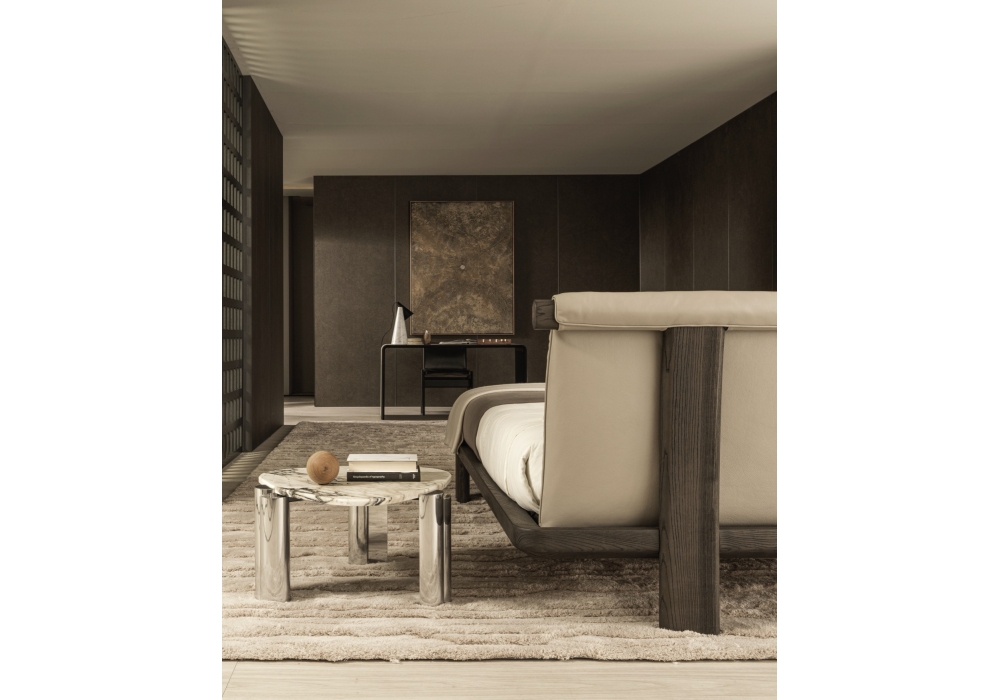 Tibeau diseñada por GamFratesi para Molteni&C es una cama con cabecero doble, con la distintiva forma de “T”. Estructura en madera de roble color café y cojines del cabecero tapizados en tejido o piel. Las líneas estructurales y el diseño de las patas evocan elementos históricos y tribales, creando una profunda conexión con el pasado.