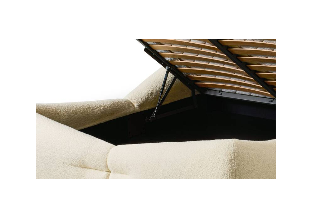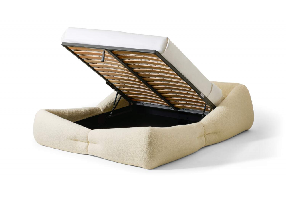 Mon-Nid diseñada por Patricia Urquiola para Cassina es una cama completamente acolchada con guata de fibra de poliéster reciclada. Tapizada en tela. También disponible con sistema de contenedores con redes y láminas.
