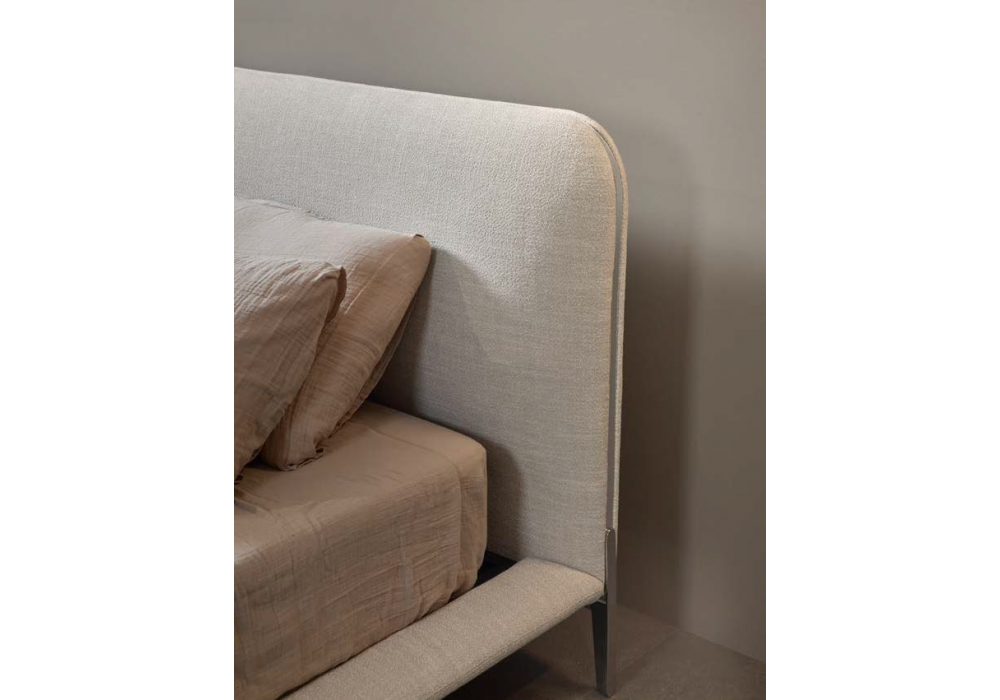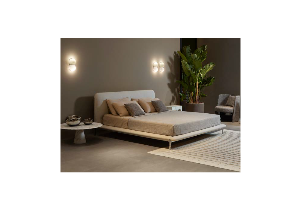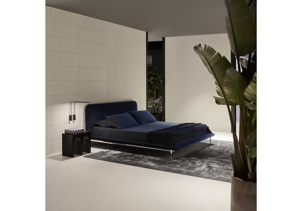 Sofi diseñada por Carlo Colombo para Antonio Lupi es una cama con base, cabecero y pies en aluminio Brill. La estructura interna del cabecero y el marco de la cama está fabricada con contrachapado y madera maciza de abeto. Está acolchada con espuma de poliuretano de diferentes densidades y tapizada con tela o cuero no extraíble. El somier tiene un marco de metal pintado de negro y láminas de haya maciza.