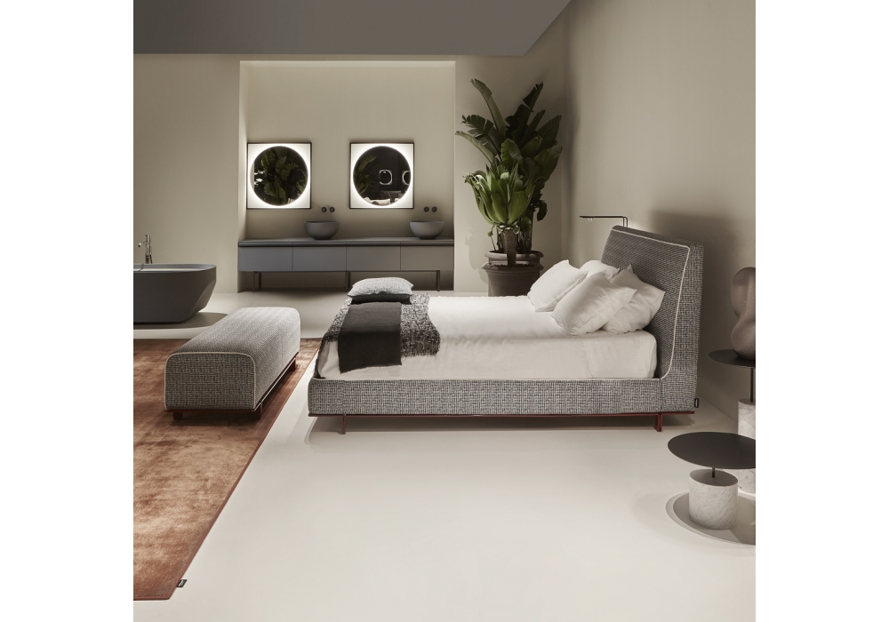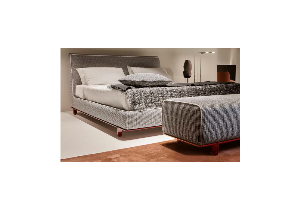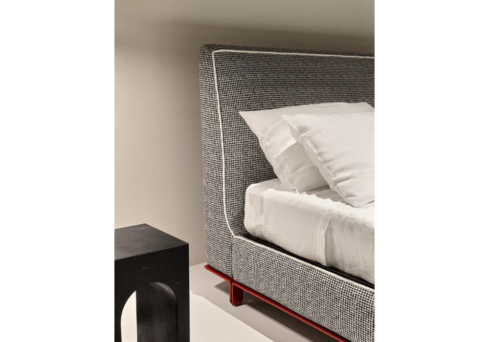 Ginevra diseñada por Carlo Colombo para Antonio Lupi es una cama con estructura de metal esmaltado y acolchado de espuma de poliuretano no deformable. Tapicería de tela o cuero, no extraíble. La base de la cama cuenta con un marco de metal pintado de negro y láminas de haya maciza.