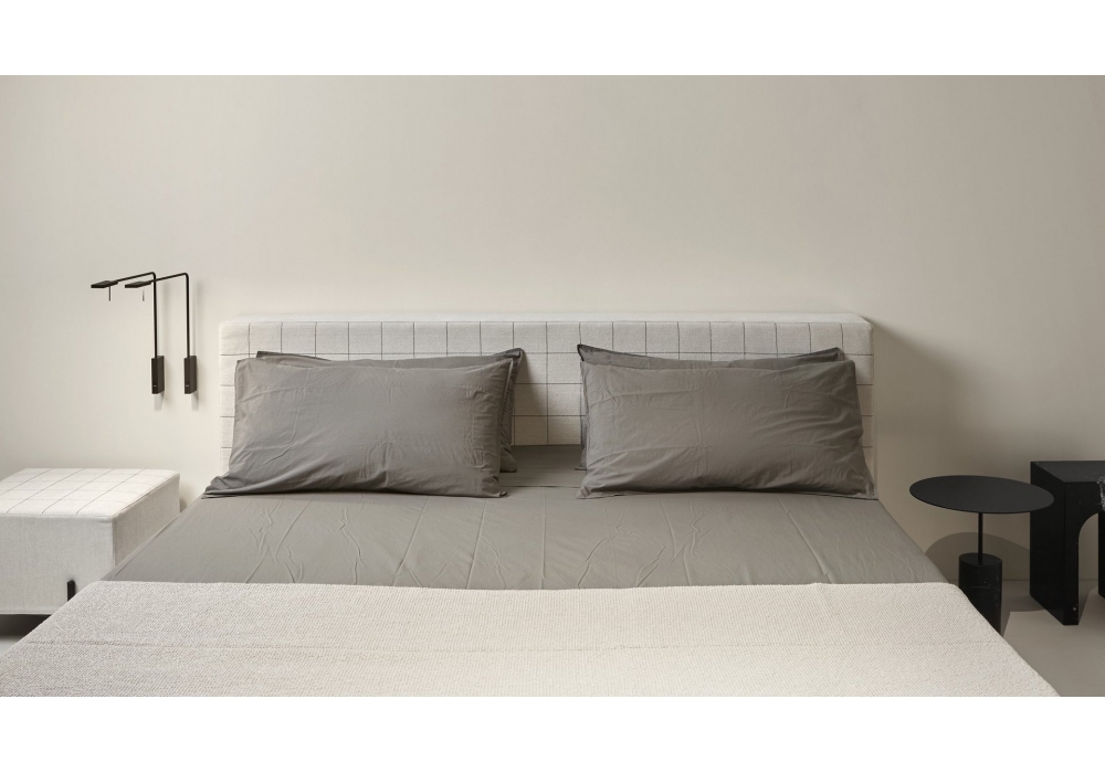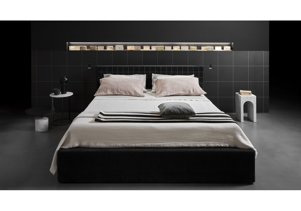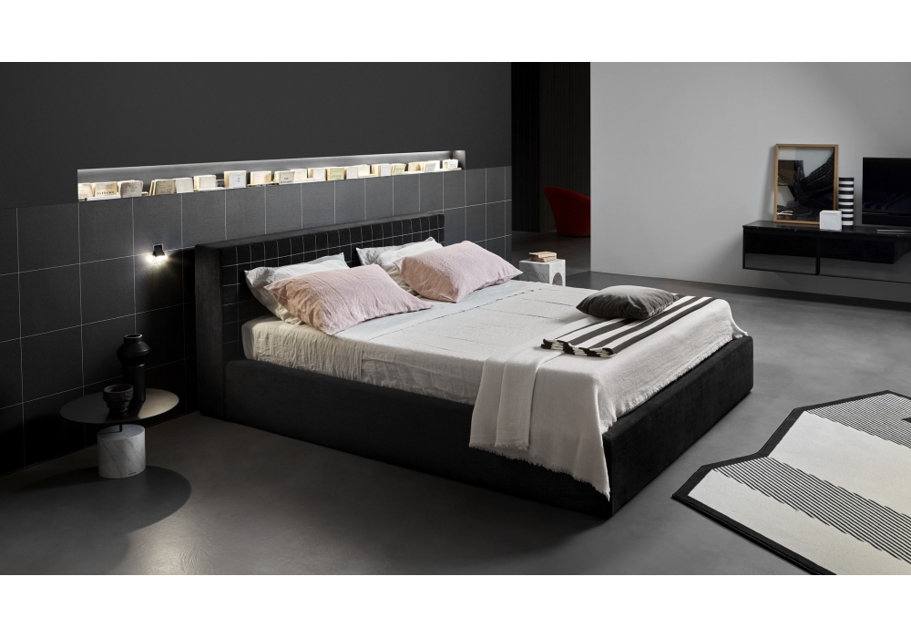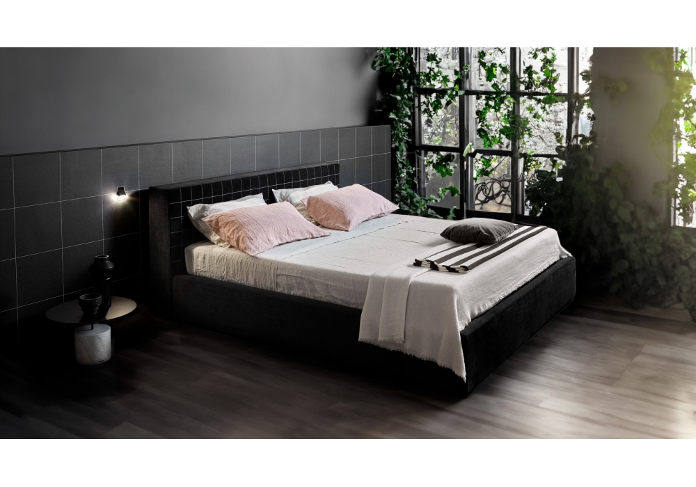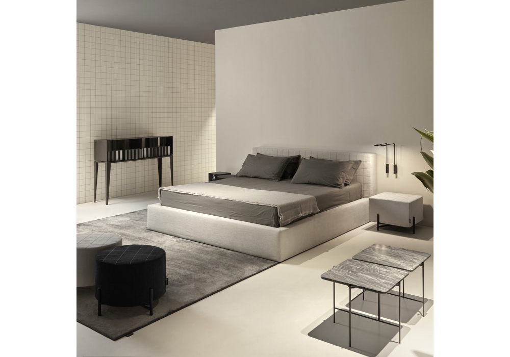 TLR diseñada por Gumdesign para Antonio Lupi es una cama con base de contrachapado CARB de varios grosores y cabecero de contrachapado CARB de varios grosores y listones de abeto. El acolchado es de poliuretano moldeado de diferentes densidades, recubierto de fibra de poliéster. Tapizado en tela o piel y patas de plástico.