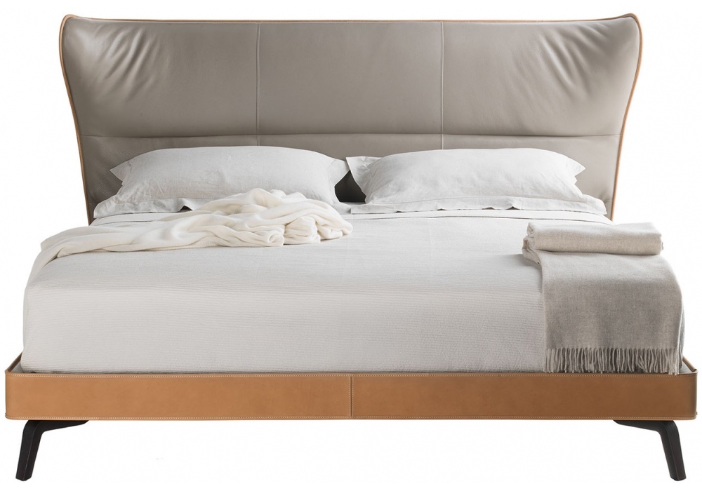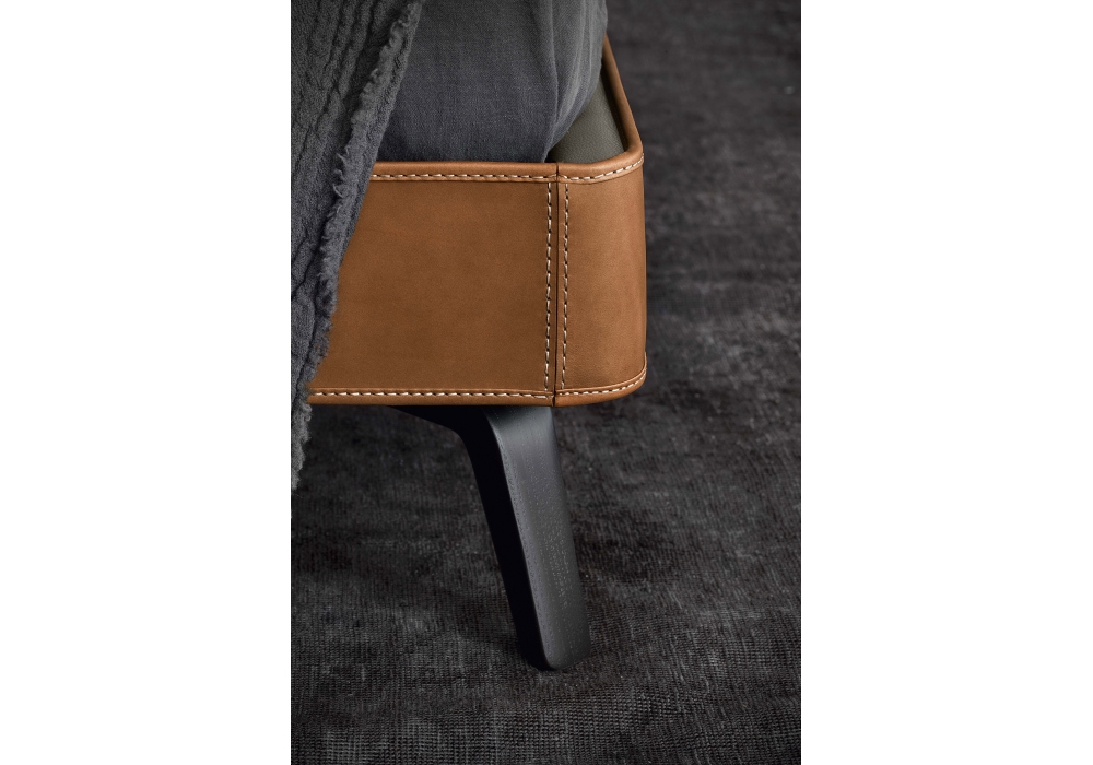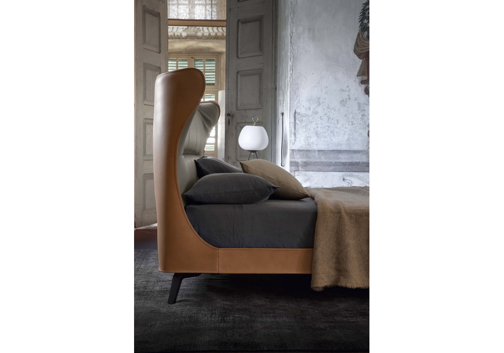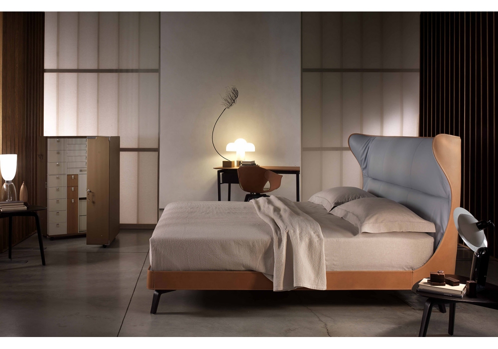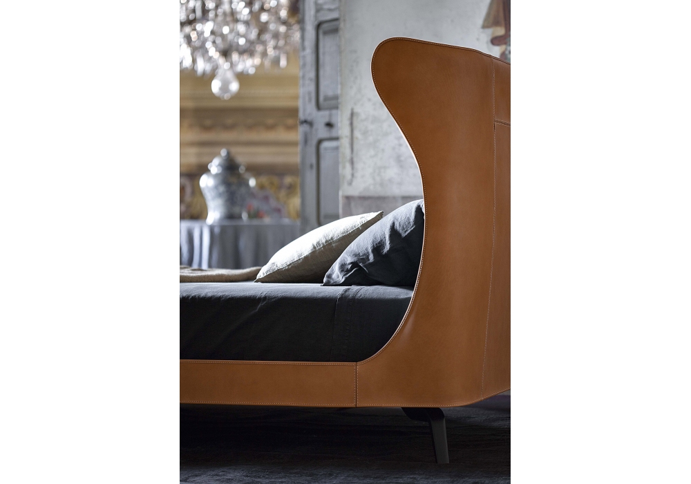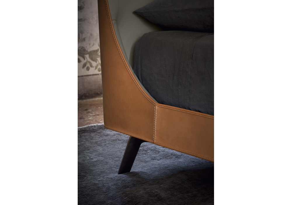 Mamy Blue, diseño de Roberto Lazzeroni para Poltrona Frau, es una cama con cabecero de madera maciza de haya, álamo y contrachapado de abedul. Las dos partes laterales perfiladas son de espuma de poliuretano moldeada. Los pies están disponibles en dos acabados: fresno teñido wengé o moka. La parte trasera del cabecero y el borde exterior del somier están tapizados en piel Cuoio Saddle Extra, mientras que la parte delantera del cabecero y la parte superior del somier son de piel Pelle Frau®. La combinación de los materiales queda realzada por las elegantes costuras de contraste visibles.