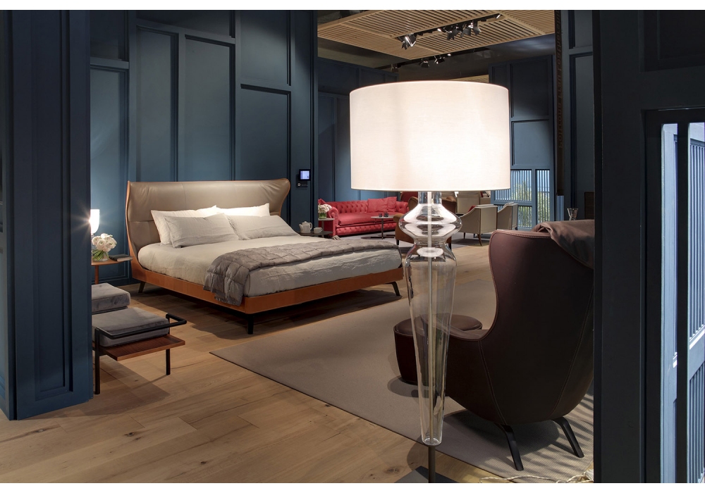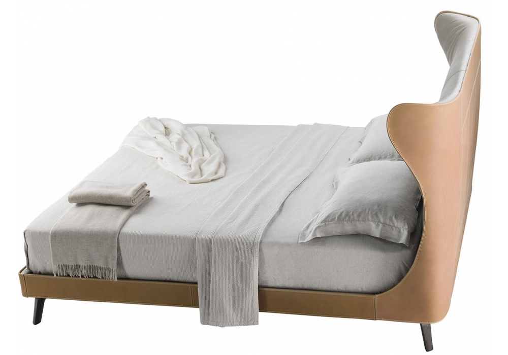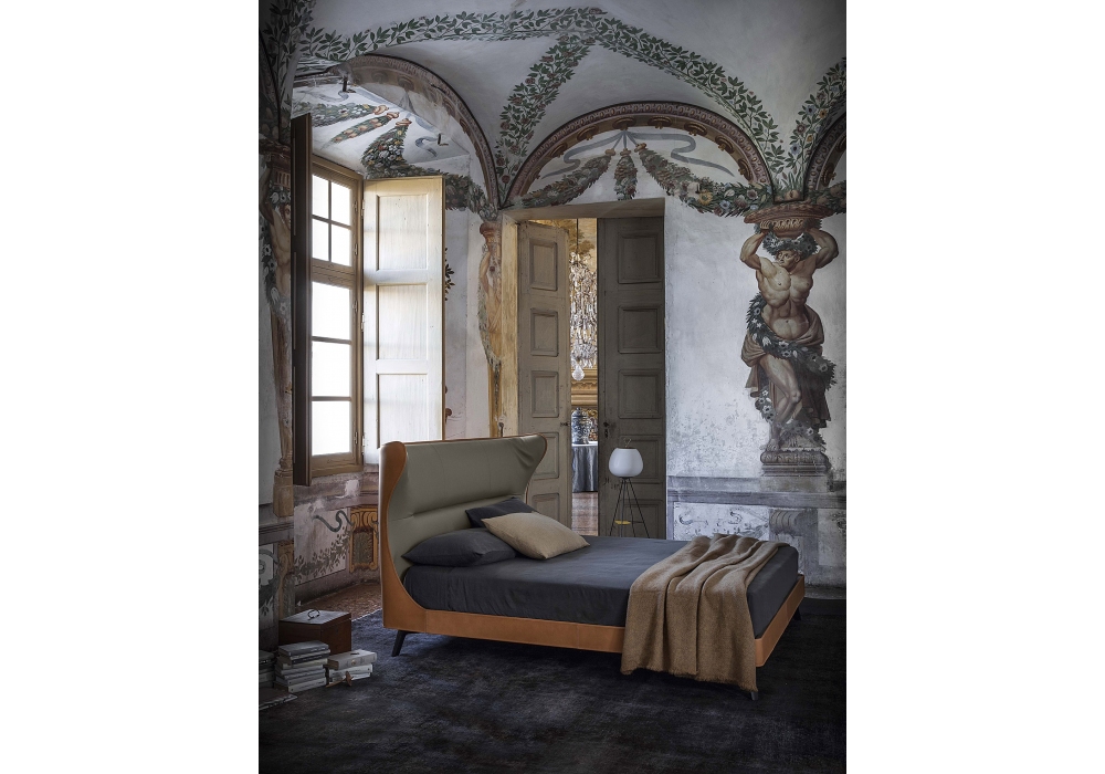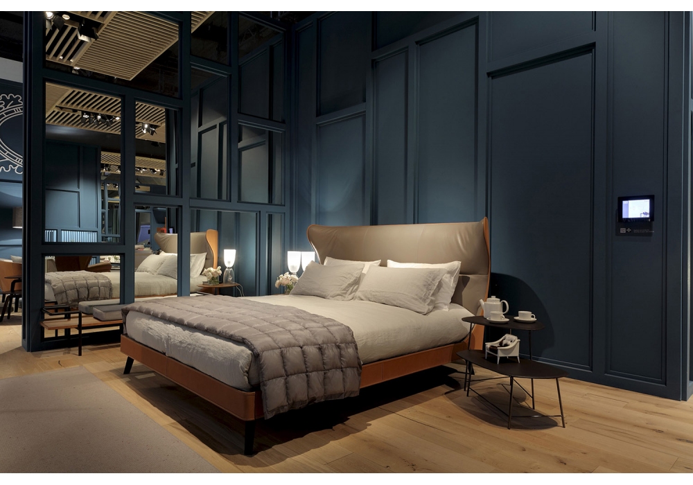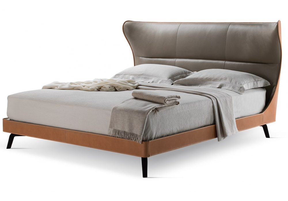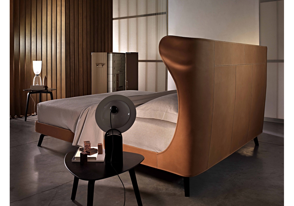 Mamy Blue, diseño de Roberto Lazzeroni para Poltrona Frau, es una cama con cabecero de madera maciza de haya, álamo y contrachapado de abedul. Las dos partes laterales perfiladas son de espuma de poliuretano moldeada. Los pies están disponibles en dos acabados: fresno teñido wengé o moka. La parte trasera del cabecero y el borde exterior del somier están tapizados en piel Cuoio Saddle Extra, mientras que la parte delantera del cabecero y la parte superior del somier son de piel Pelle Frau®. La combinación de los materiales queda realzada por las elegantes costuras de contraste visibles.