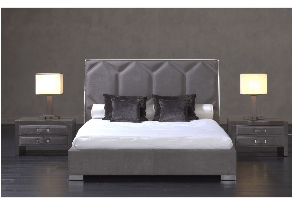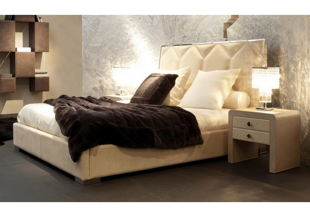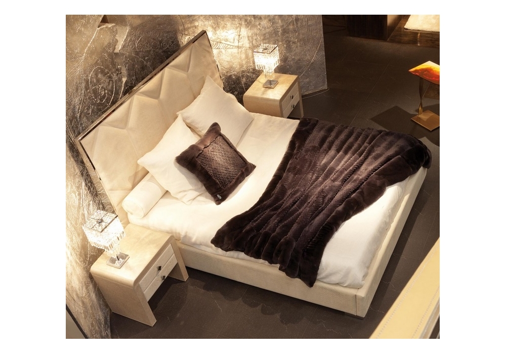 Soufflè diseñada por Rugiano es una cama disponible con revestimiento de piel en diferentes acabados. Disponible en varios tamaños y en la versión con caja de almacenamiento. Detalles en latón bronceado o cromado.