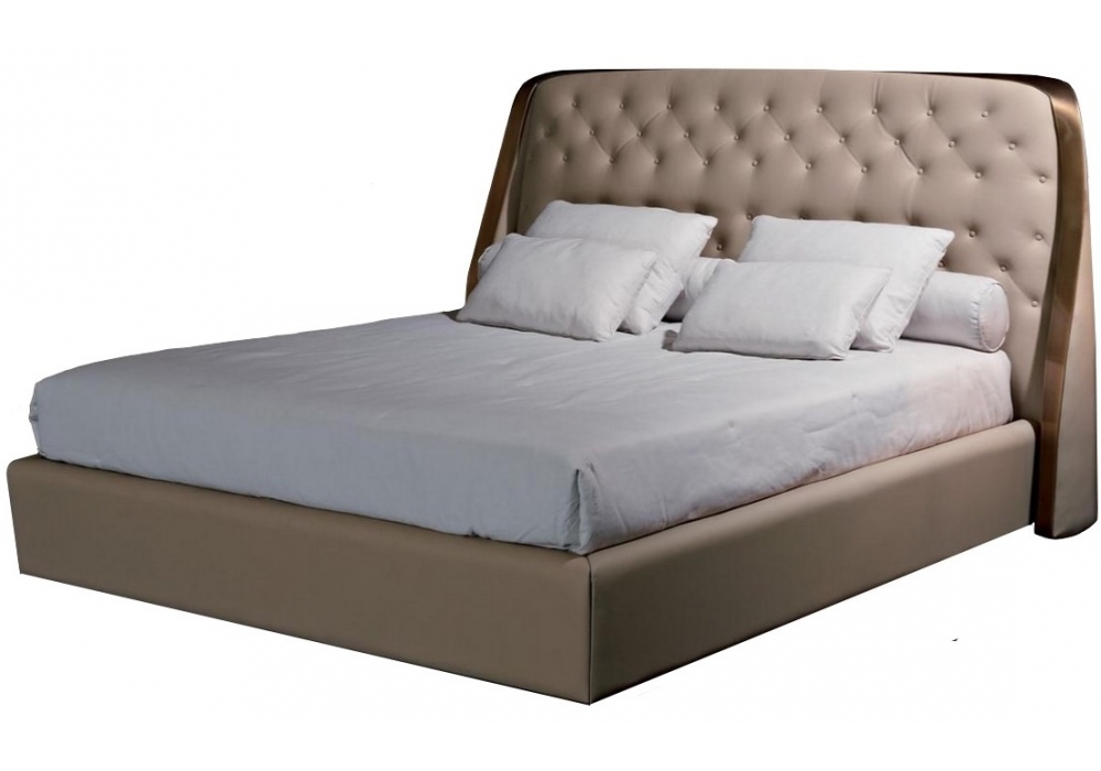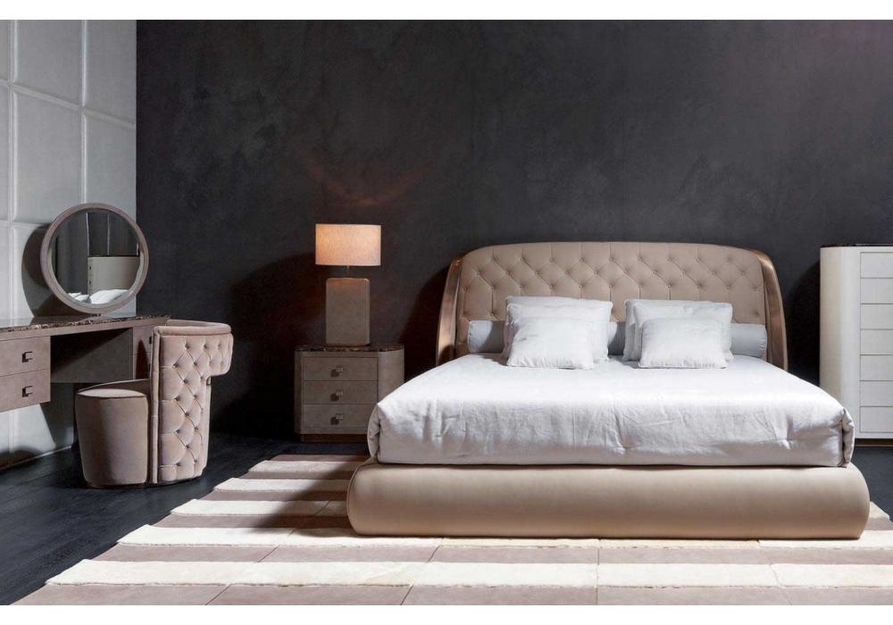 Damasse diseñada por Rugiano es una cama tapizada en piel o tela en diferentes acabados. Disponible en varios tamaños. Detalles de latón bronceado.
