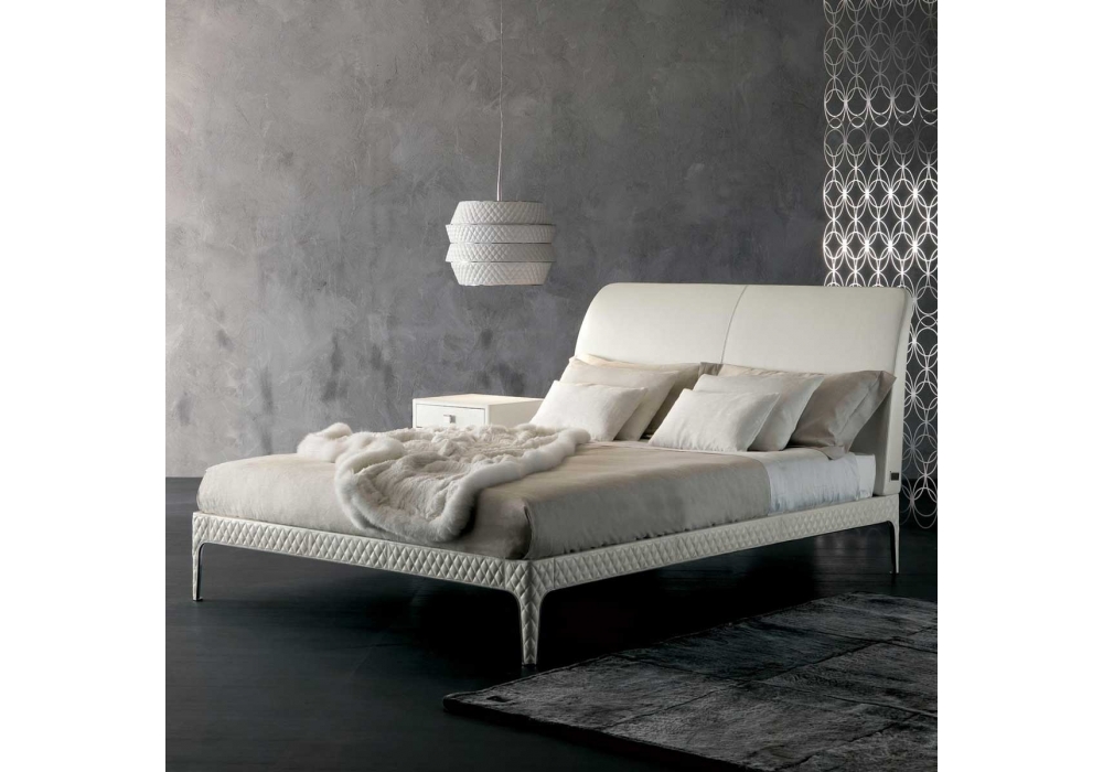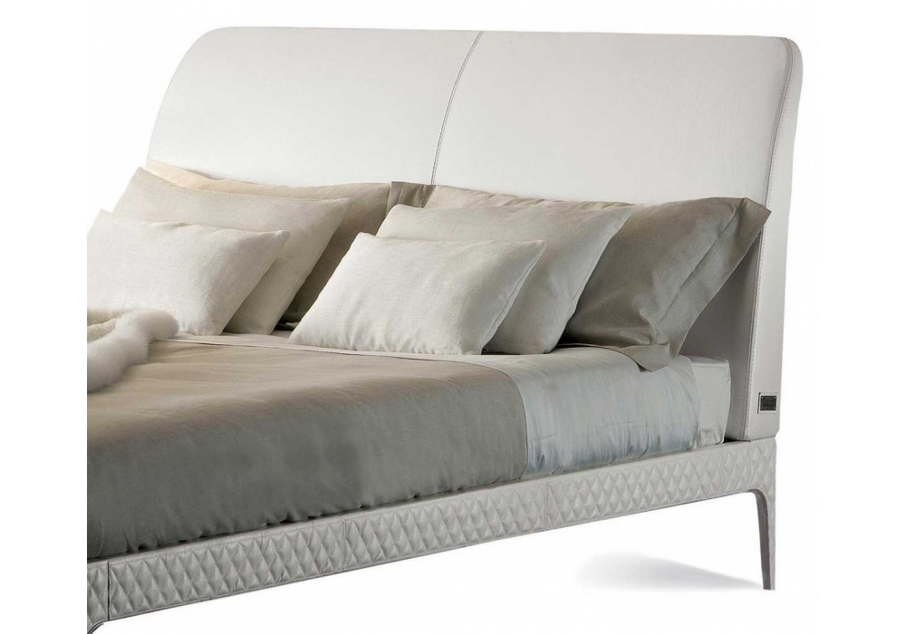 Taylor diseñada por Rugiano es una cama tapizada en piel o tela en diferentes acabados. Detalles en latón bronceado o cromado. Colchón no incluido.