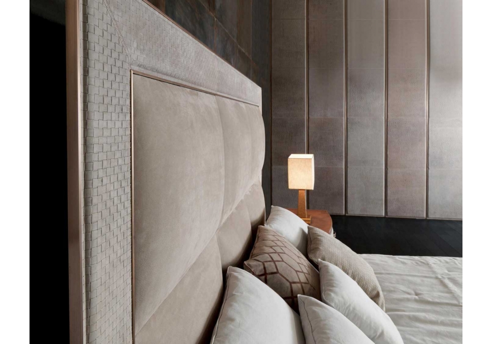 Aura diseñada por Rugiano es una cama con cabecera baja y tapizado en piel o tela en diferentes acabados. También disponible en la versión con caja de almacenamiento. Detalles de latón bronceado. Colchón no incluido.