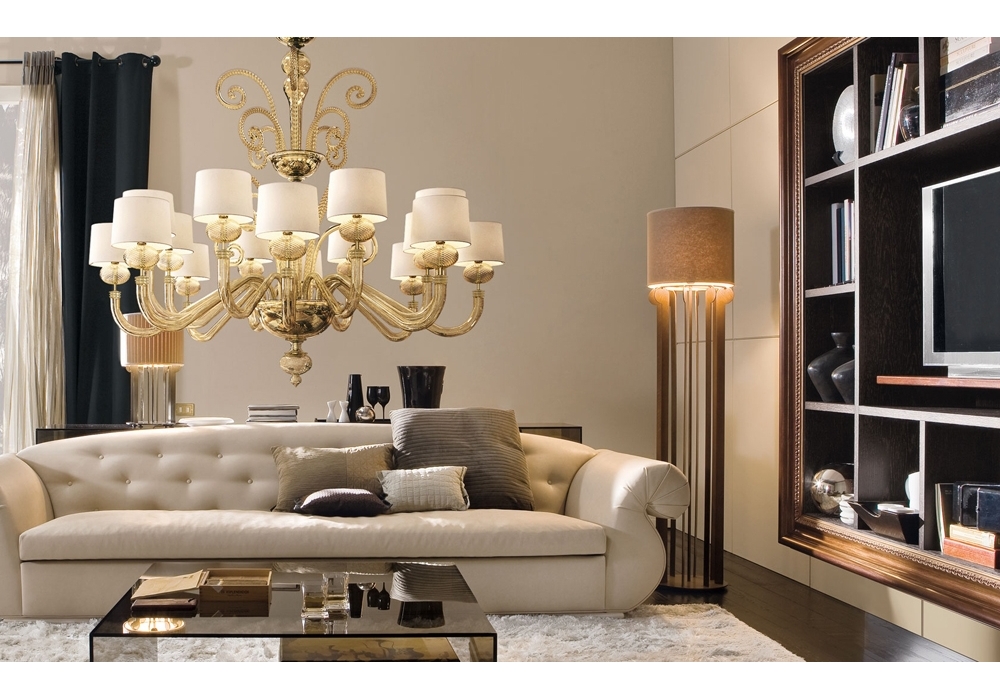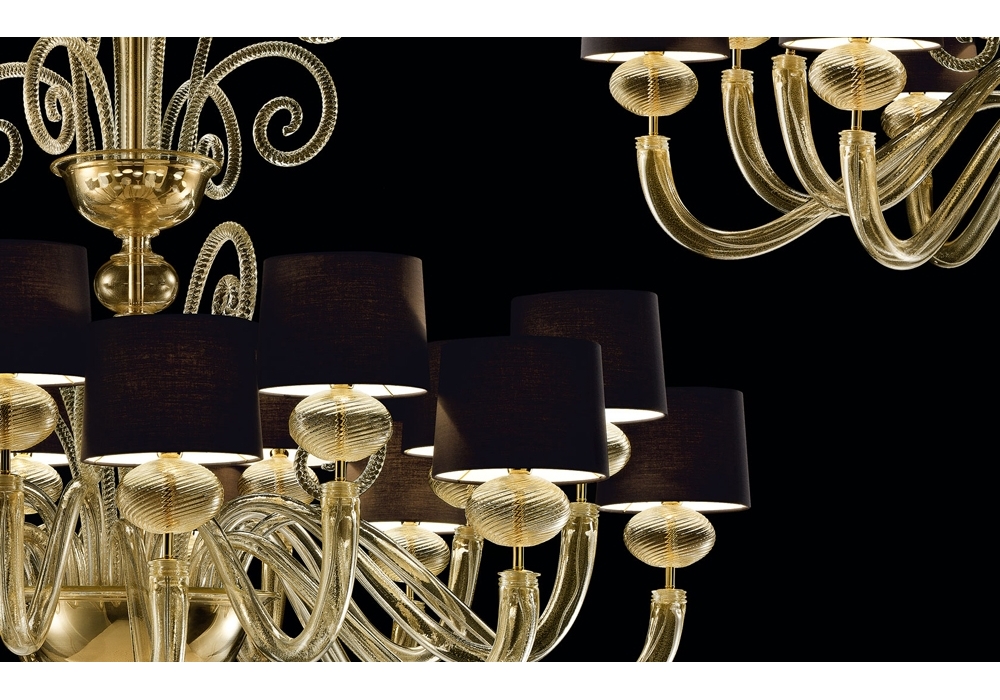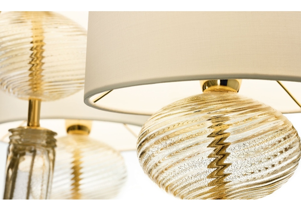 Tangeri producida y diseñada por Barovier & Toso es una candelabro con estructura portante y detalles en metal revestido de cristal veneciano. Las pantallas son de tela y protegen fuentes de luz LED o halógenas regulables. Tangeri está disponible en diferentes modelos y acabados.
