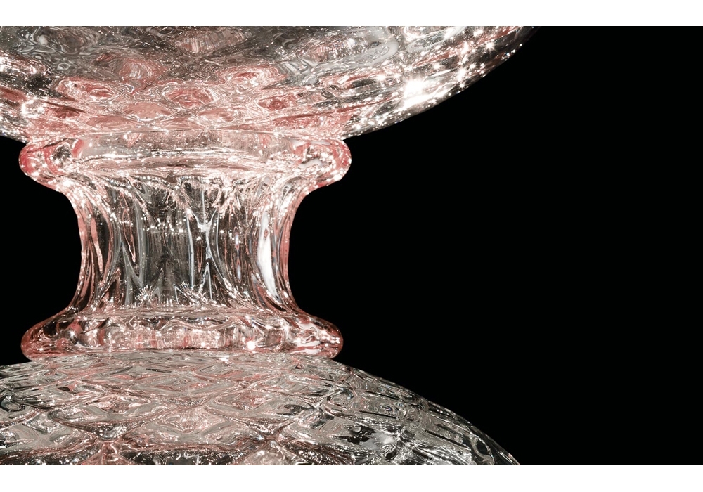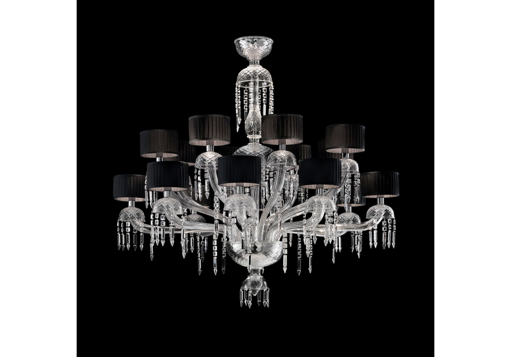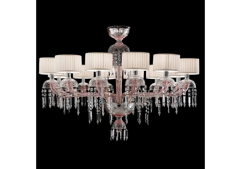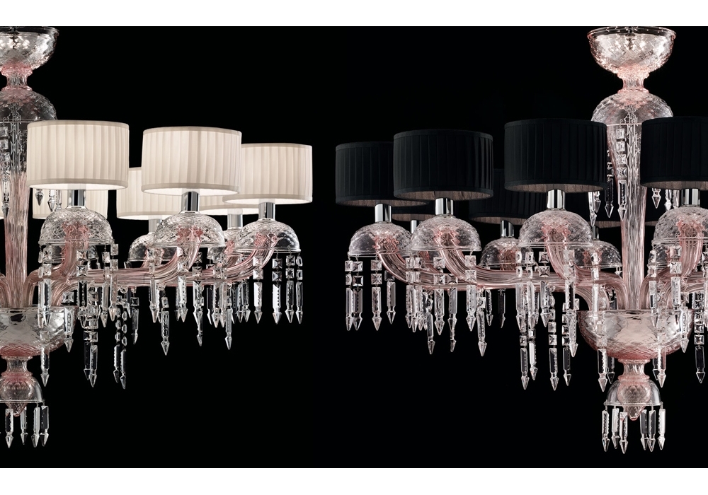 Première Dame diseñada y producida por Barovier & Toso es una candelabro estructurada de 1 o más niveles superpuestos con estructura de metal y brazos revestidos de cristal y cristal veneciano. Los brazos soportan pantallas de tela que protegen las fuentes de luz LED o halógenas regulables. Première Dame está disponible en diferentes modelos y acabados.