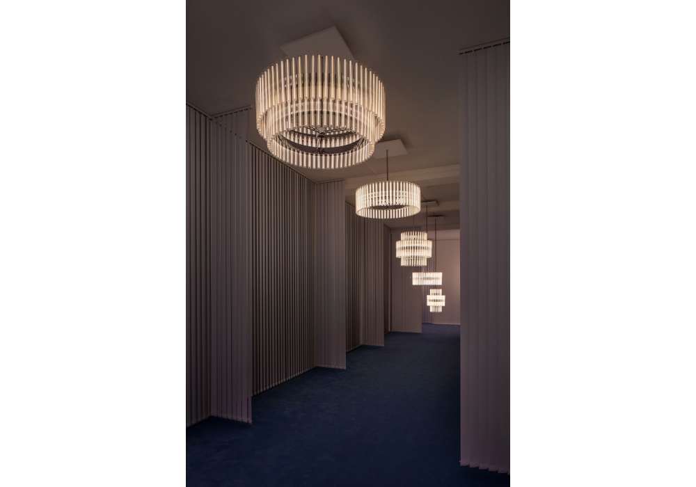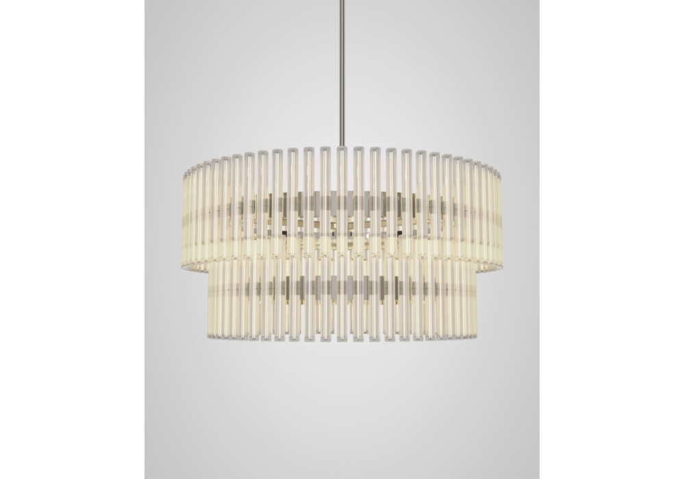 Aurora Tiered, producida y firmada por Lee Broom, es una araña circular con una estructura portante de acero cromado adornada con varios elementos tubulares de vidrio soplado. La fuente de luz adoptada es del tipo LED regulable. Aurora Tiered se puede personalizar para crear candelabros de varios niveles uniéndolos.