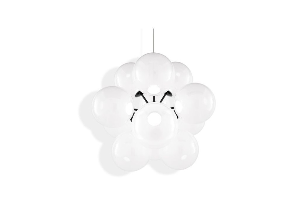 Globe Burst diseñada por Tom Dixon es una lámpara de araña de policarbonato con esferas espejadas, disponible en diferentes acabados.