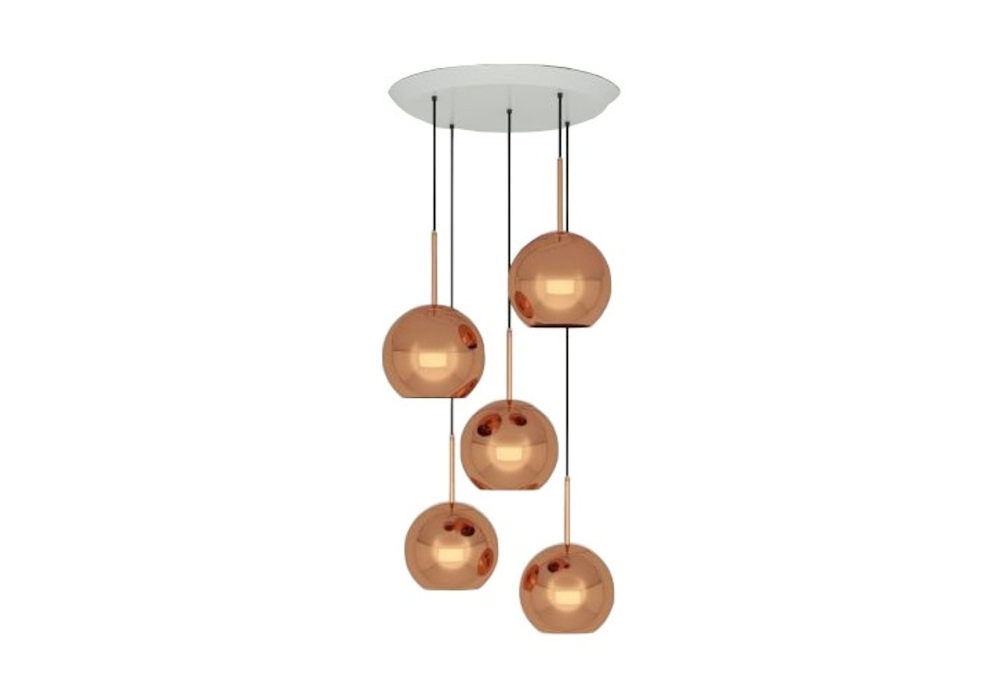 Copper 25 Round diseñado por Tom Dixon es un sistema de suspensión compuesto por cinco lámparas de policarbonato en acabado cobre.