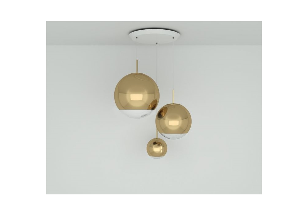 Mirror Ball Range Round diseñado por Tom Dixon es un sistema de suspensión compuesto por tres lámparas de policarbonato. Sistema disponible en diferentes acabados.