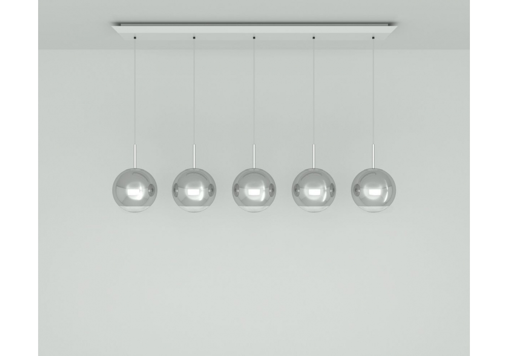 Mirror Ball Linear 25 diseñado por Tom Dixon es un sistema de suspensión compuesto por cinco lámparas de policarbonato. Sistema disponible en diferentes acabados.