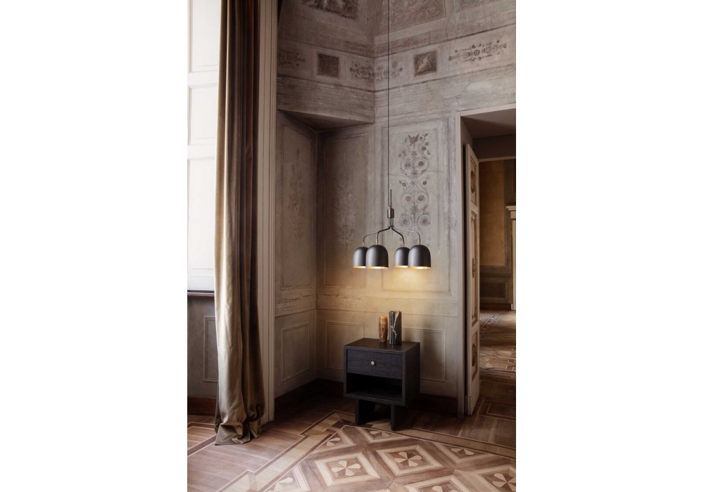 Howard diseñado por Space Copenhagen para Gubi es un candelabro con pantallas de latón con acabado bronce e interior de latón cepillado o pantalla de porcelana china. Está disponible con 4 o 6 pantallas de lámpara.