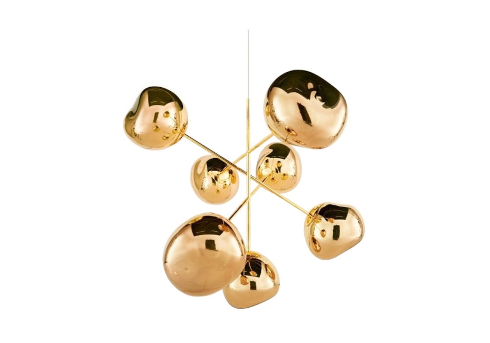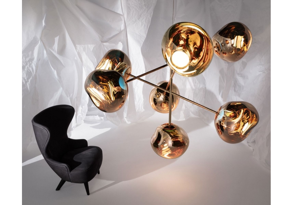 Melt Large diseñada por Tom Dixon es una lámpara de araña compuesta por siete lámparas de policarbonato, disponibles en diferentes acabados.