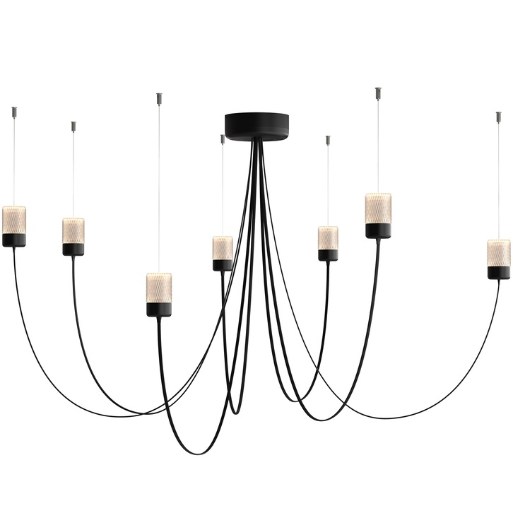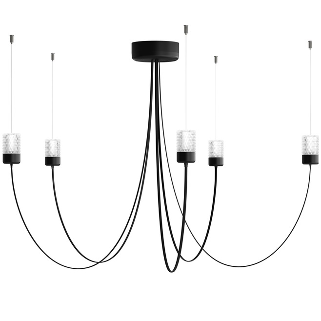 Gravity Chandelier diseñada por Paul Cocksedge para Moooi es una lámpara de araña LED regulable realizada con difusores de vidrio facetado y estructura de acero con recubrimiento de polvo negro, cables de suspensión ultrafinos. Disponible en dos configuraciones: cinco o siete brazos.