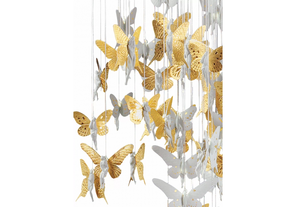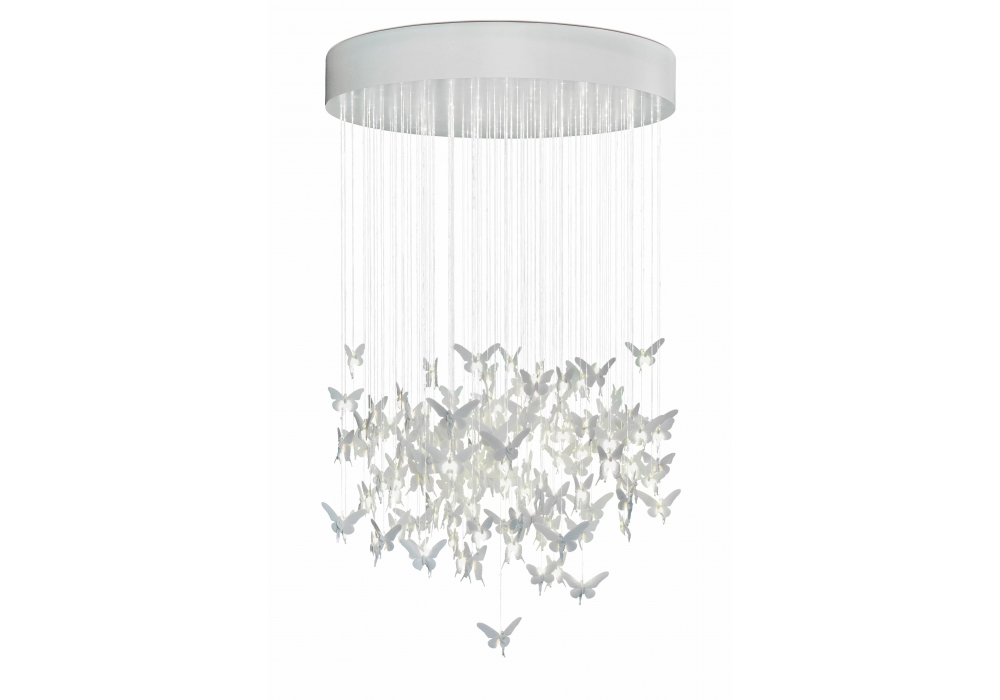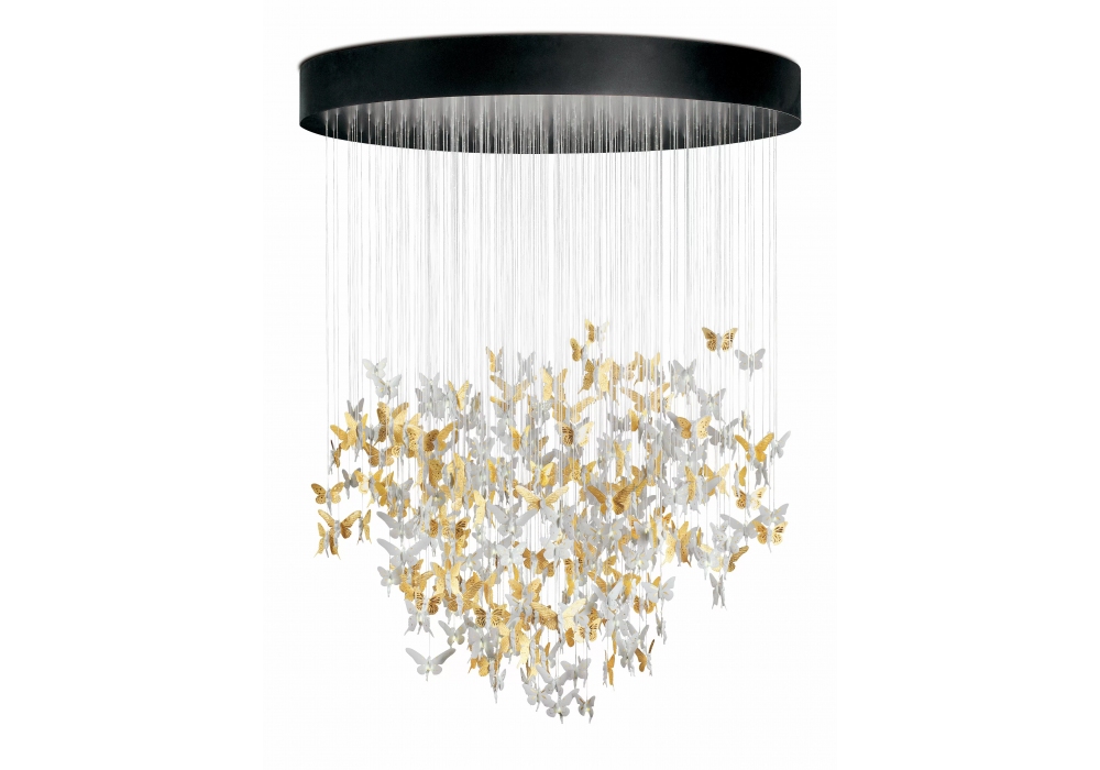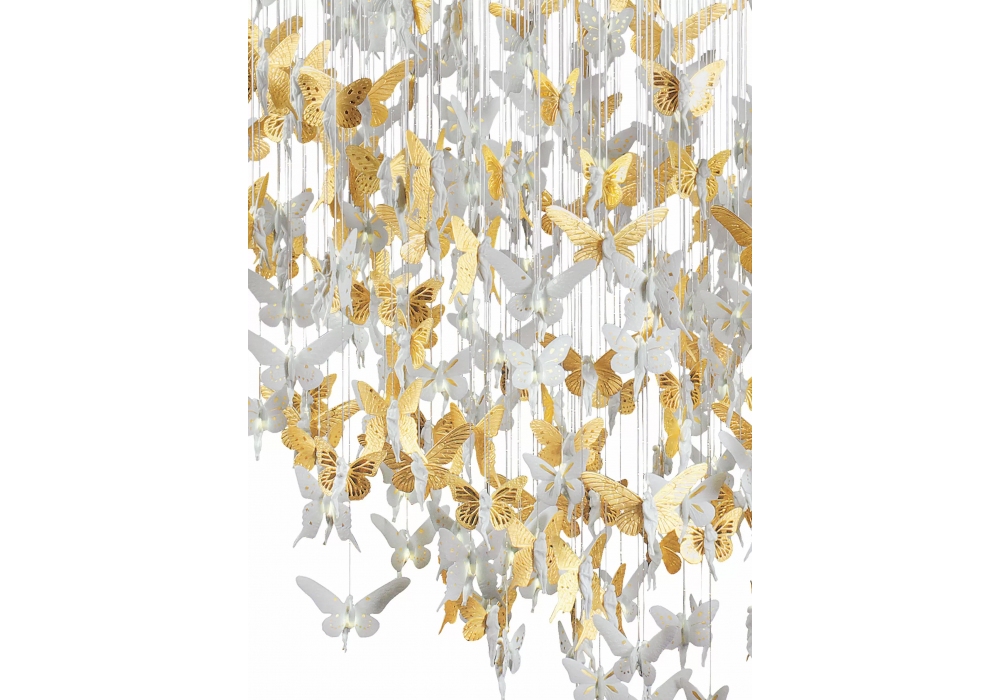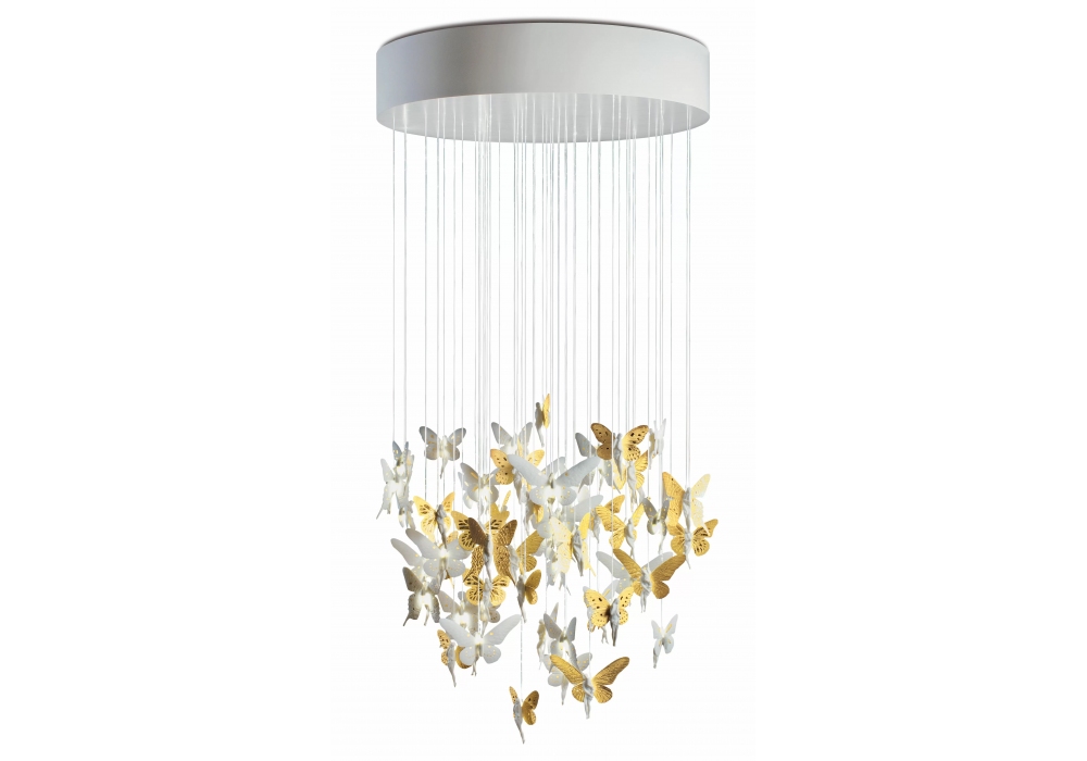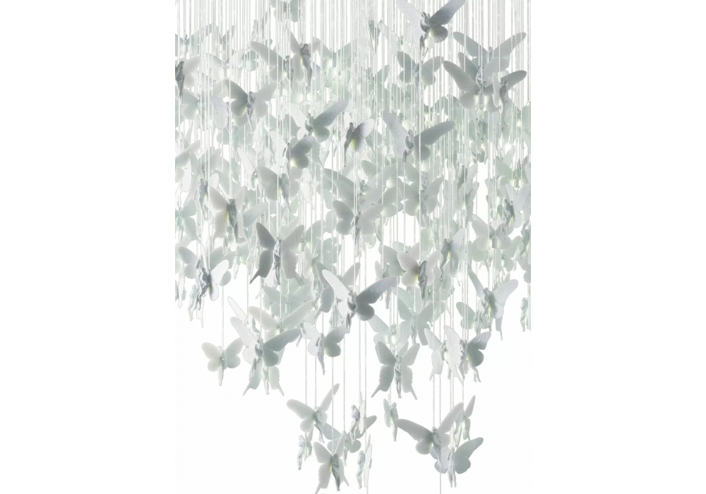 Niagara esculpida por Dept. Diseño y Decoración y diseñada por Bodo Sperlein para Lladró es una candelabro cilíndrica sostenida por una estructura metálica en diferentes acabados. Los colgantes se cuelgan de cables de fibra óptica fabricados y pintados íntegramente a mano. Niagara está disponible en diferentes tamaños.