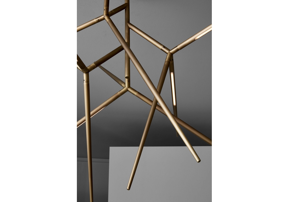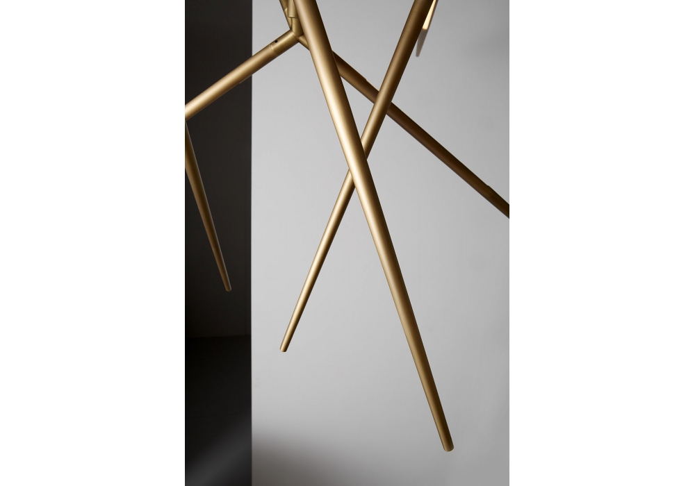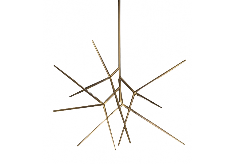 Spear diseñada por Massimo Tonetto para Venicem es una lámpara de araña de luz directa e indirecta. Estructura en latón bruñido claro, níquel negro brillo o níquel negro mate. Tira de LED en el interior de los brazos. Disponible en diferentes tamaños.