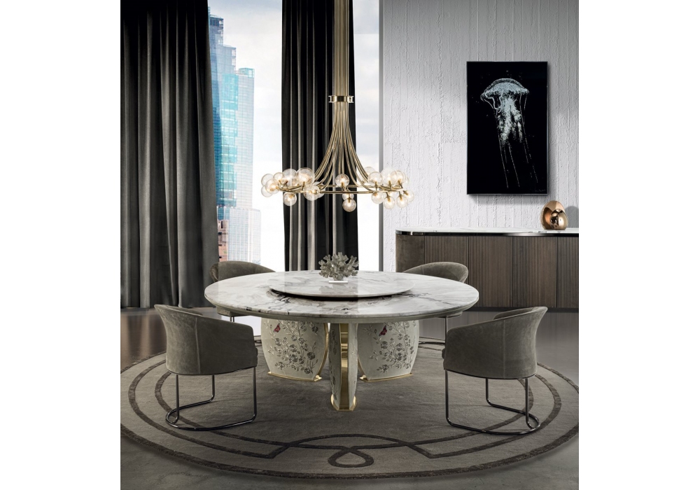 Rialto diseñado por Giuseppe Iasparra para Longhi es un candelabro con estructura de metal en acabados galvánicos oro claro y níquel negro. Esferas de vidrio soplado de diferentes dimensiones con inserciones de oro para la estructura en oro claro y latón para la versión en acabado níquel negro.
