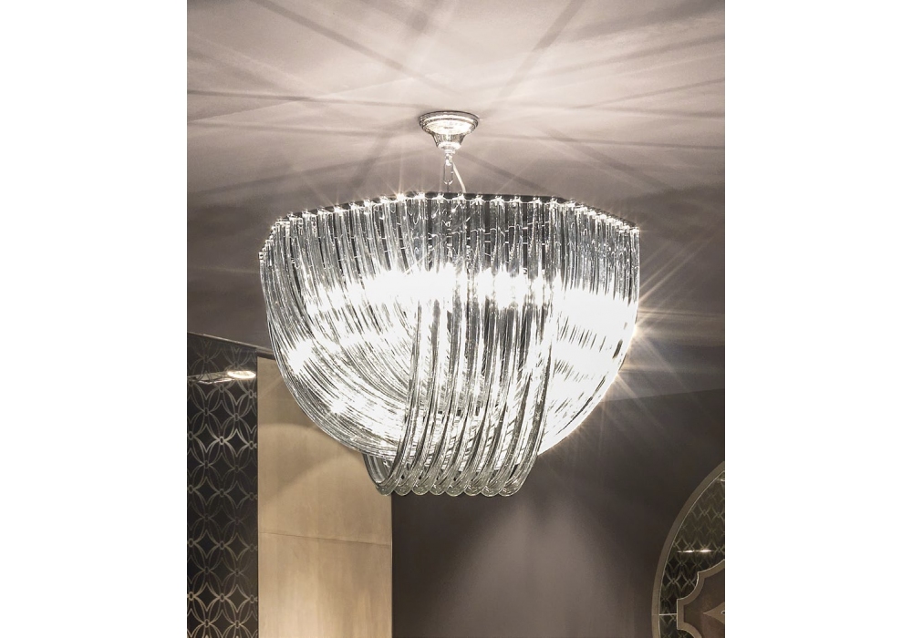 Elisabeth diseñado por Giuseppe Iasparra para Longhi es un candelabro en cristal de Murano tejido con base octogonal y estructura de metal.