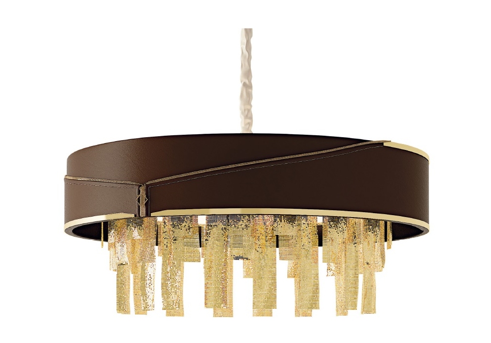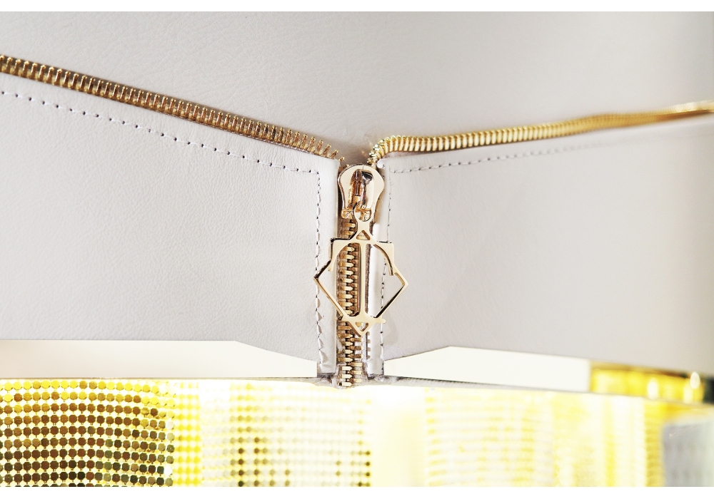 Vougue diseñado por Andrea Bonini para Turri es un candelabro con estructura en metal y revestimiento en diferentes pieles con aplicación de detalles en metal dorado y cremalleras decorativas. Disponible en dos dimensiones.