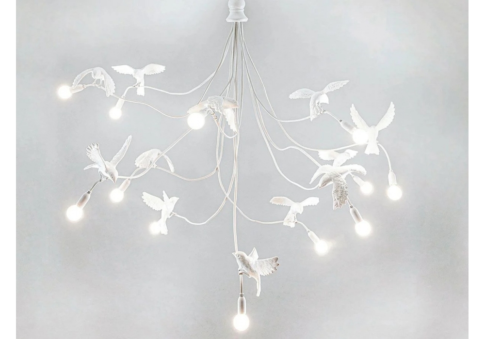 Sparrow diseñada por Marcantonio para Seletti es una lámpara de araña realizada en resina y metal blanco. Las fuentes de luz adoptadas son del tipo LED de filamento.