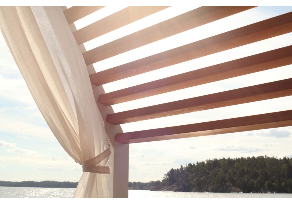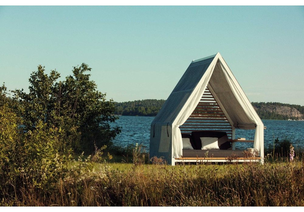 Cottage, diseñada por Patricia Urquiola para Kettal, es un cenador-diván de exterior con estructura fabricada íntegramente en aluminio. El techo es a dos aguas de aluminio y porotex con cortina de tela. La cama tiene un respaldo reclinable acolchado y revestido de tela. Cottage está disponible en diferentes acabados de estructura y tela.