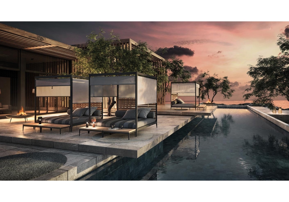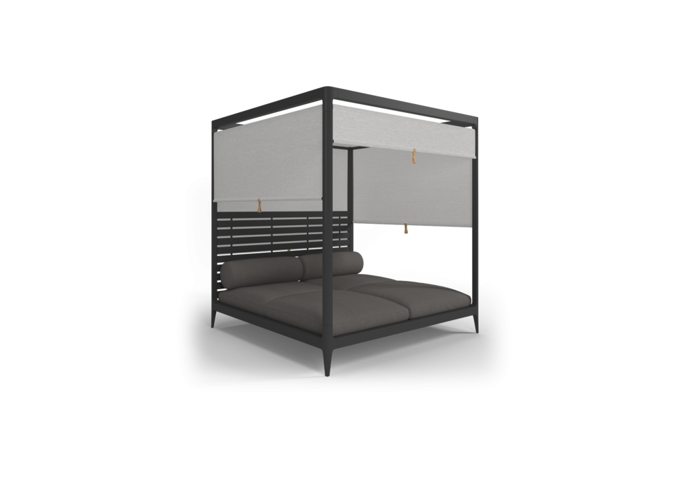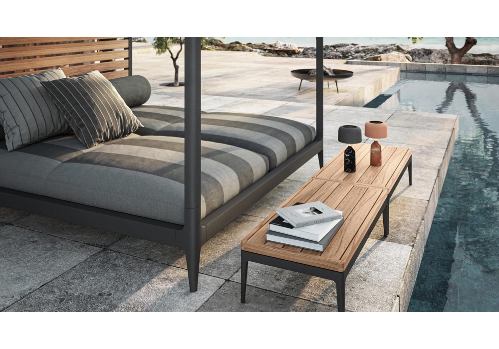 Grid diseñada por Henrik Pedersen para Gloster es una cabaña compuesta por una estructura de aluminio con recubrimiento de polvo, panel trasero en listones de teca con acabado natural o listones de aluminio con recubrimiento de polvo, y cojines de asiento y respaldo revestidos de tela para exteriores.
