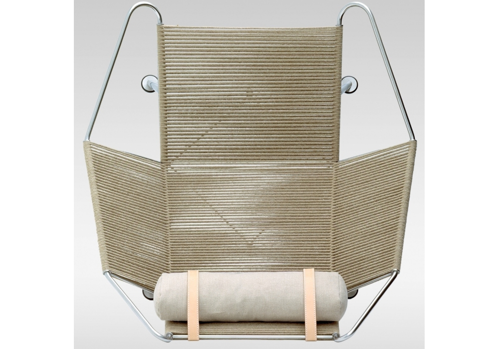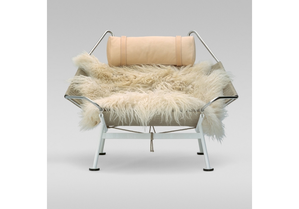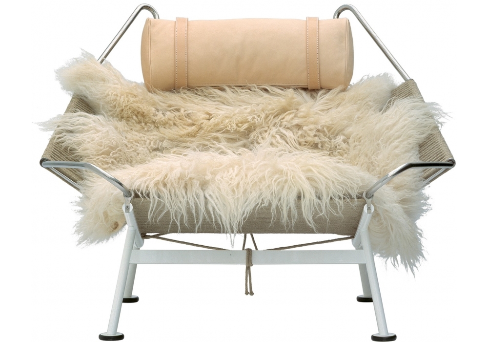With a frame made of solid stainless steel, 240 metres specially developed flag line forming the seat and back, and a longhaired sheepskin softening the industrial sharpness of the steel, this chair constitutes ultimate and luxurious relaxation!