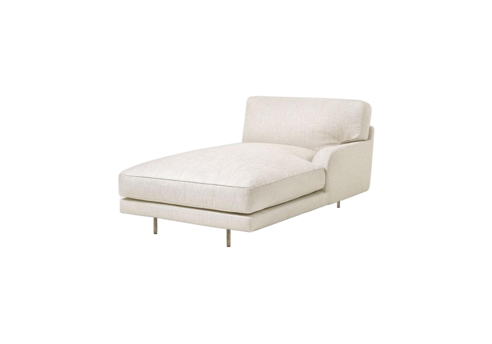 Flaneur diseñada por GamFratesi para Gubi es una chaise longue disponible con tapizado en tela o cuero y base pintada en negro mate o latón envejecido.