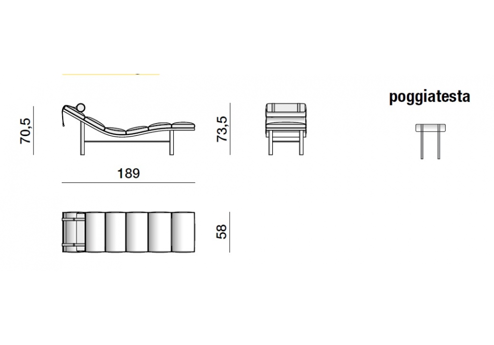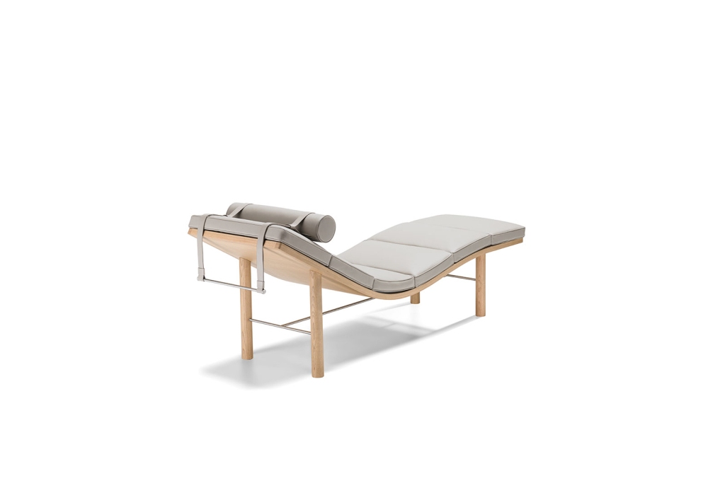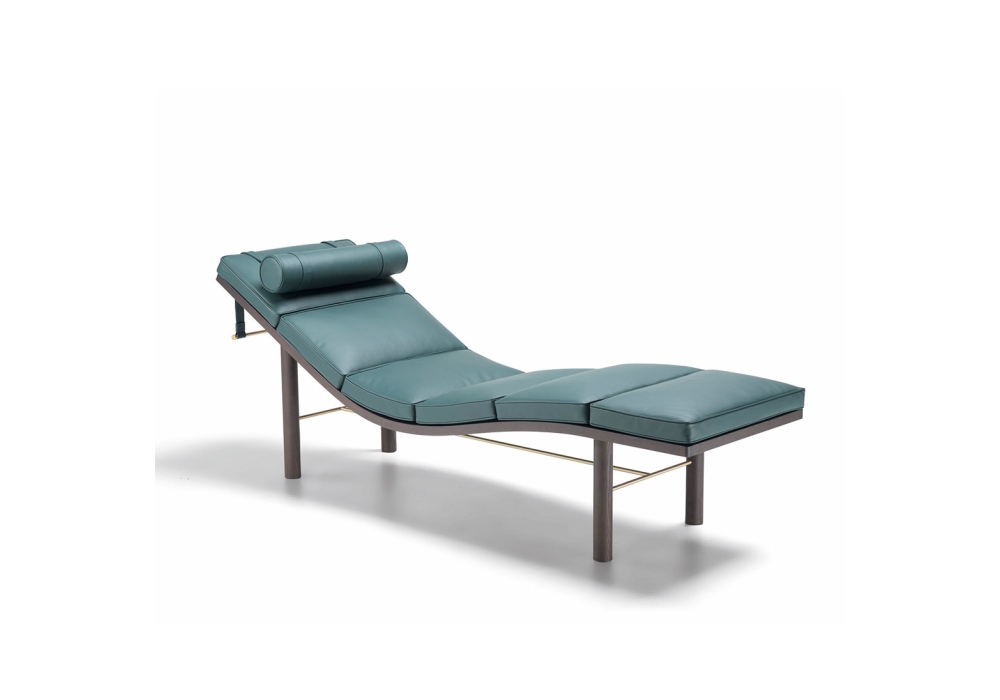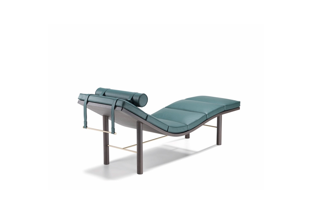 Tuscany diseñada por Naoto Fukasawa para Molteni&C es una chaise longue realizada con estructura en fresno macizo teñido eucalipto o roble amanecer, estructura en acero inoxidable satinado o latón satinado y tapizado en tejido o piel. Cojín reposacabezas enrollable opcional, con correas de piel.