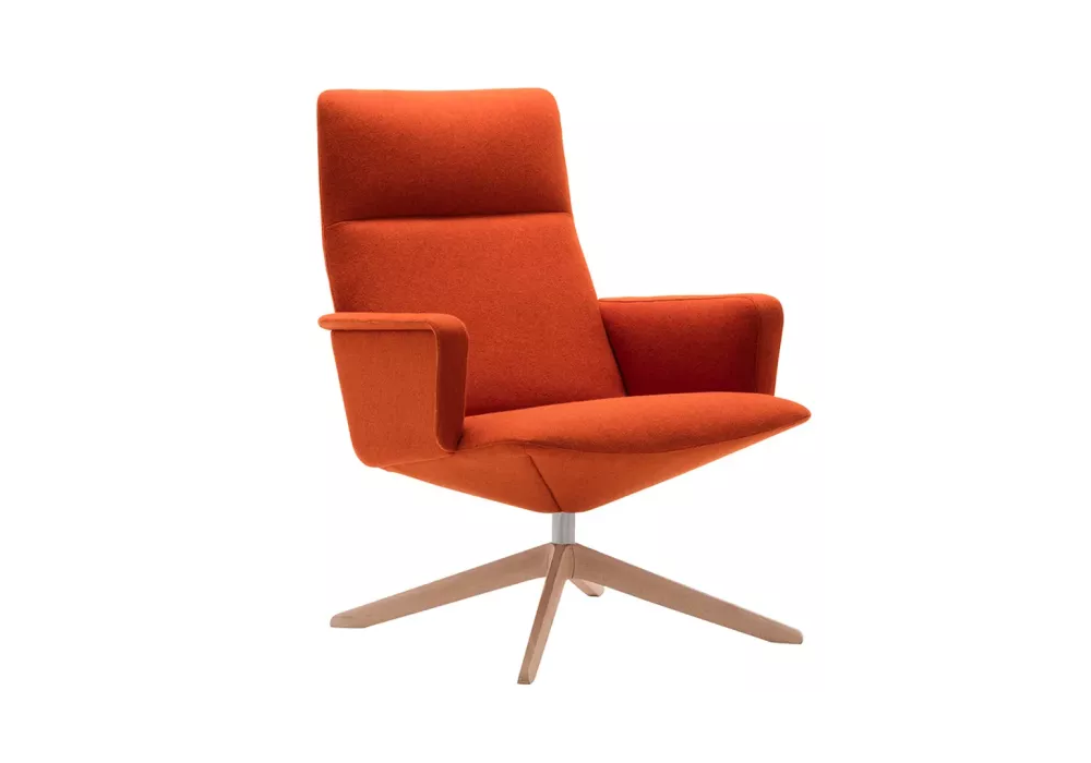 Capri Lounge diseñada por Piergiorgio Cazzaniga para Andreu World es una silla lounge con base en madera maciza de haya y tapizado del asiento en diferentes pieles, ecopiel o tejidos.