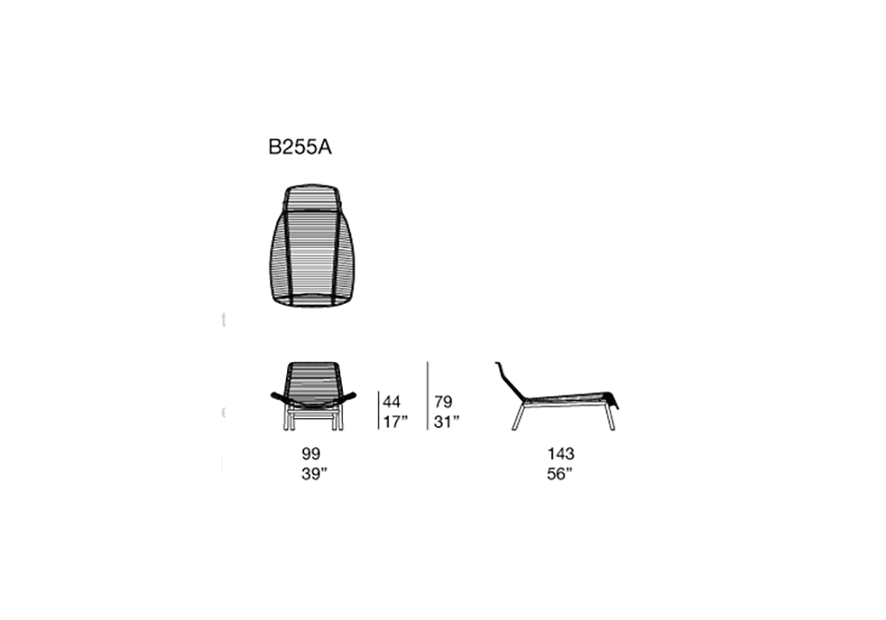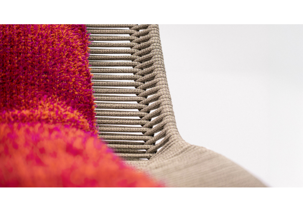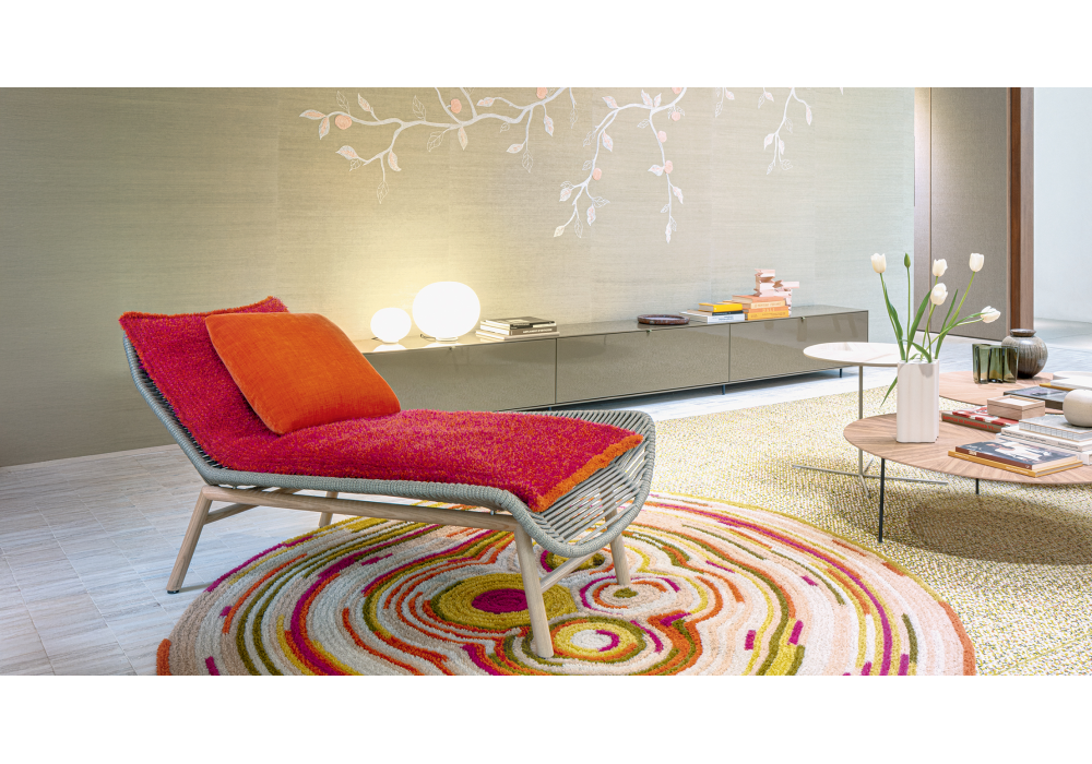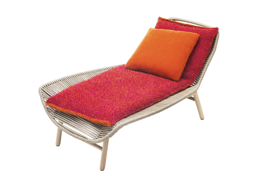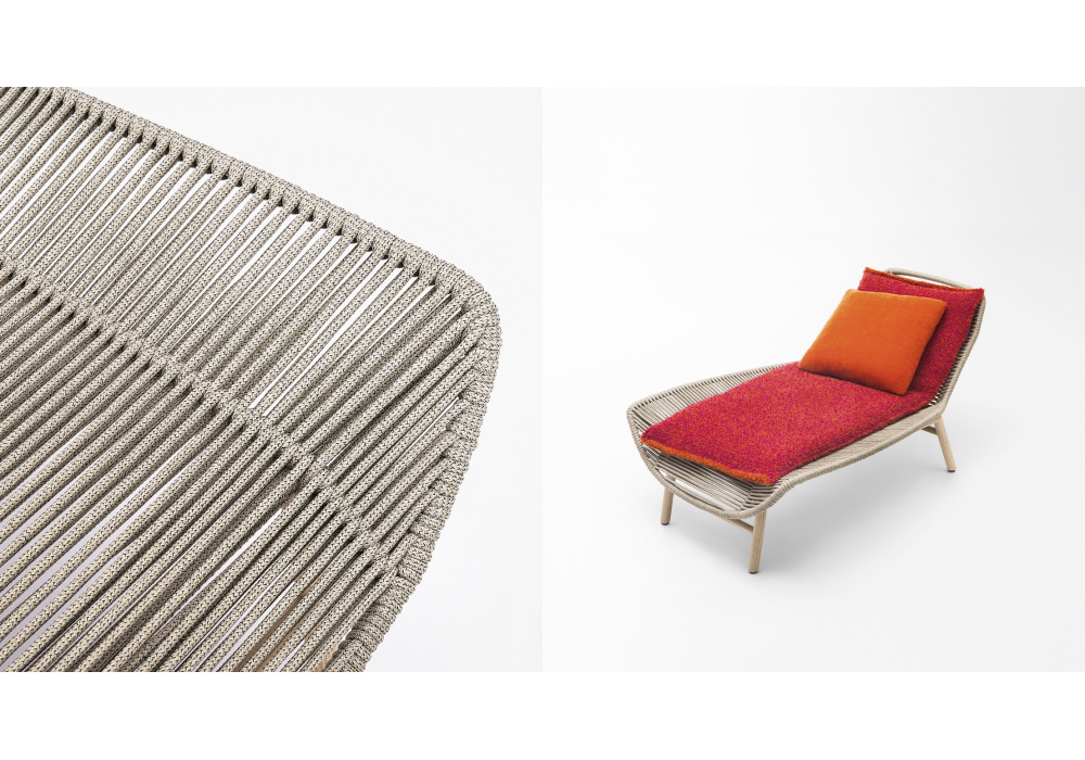 Lazy Chair diseñada por Monica Förster Design Studio para Paola Lenti es una chaise longue con estructura de madera maciza de sasafrás, perfiles de acero inoxidable y puntas de plástico. Muelles visibles tejidos a mano con correas elásticas. El colchón, que reposa sobre la estructura, está tapizado con tela Ruffle.